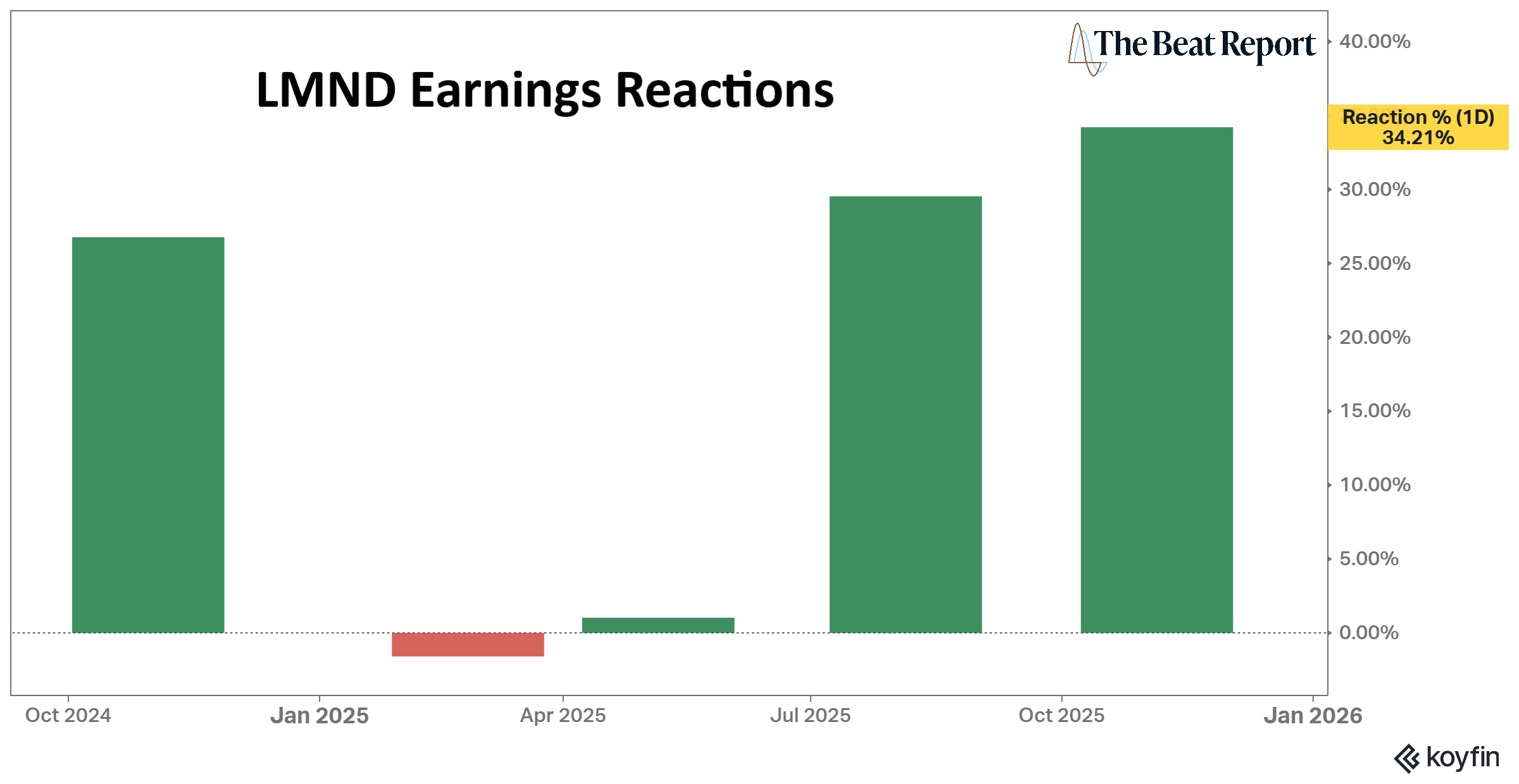 Over the past five earnings events, Lemonade has been consistently rewarded by the market, with three significant double-digit reactions and two relatively muted yet constructive responses.