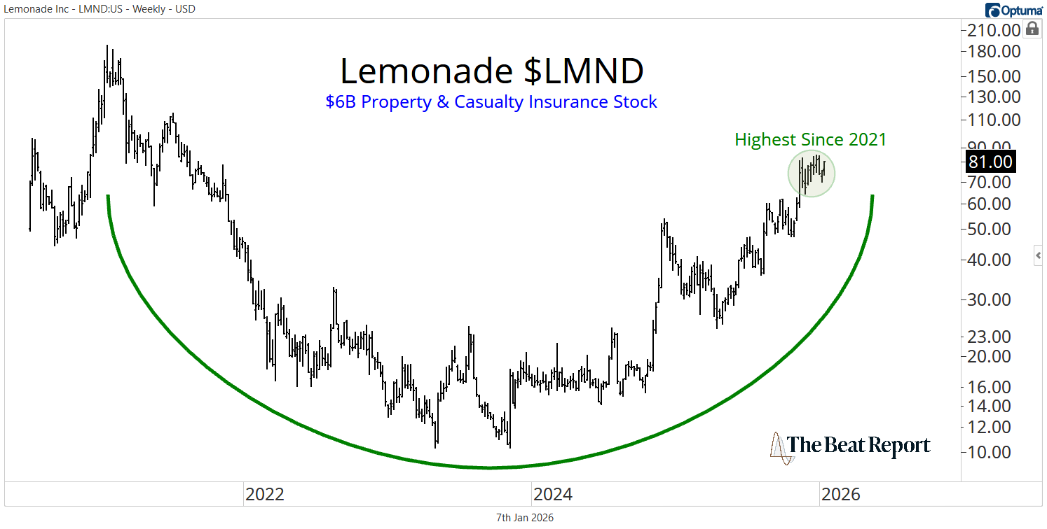 LMND is trading at its highest level since 2021 as the price climbs up the right-hand side of a massive multi-year base.