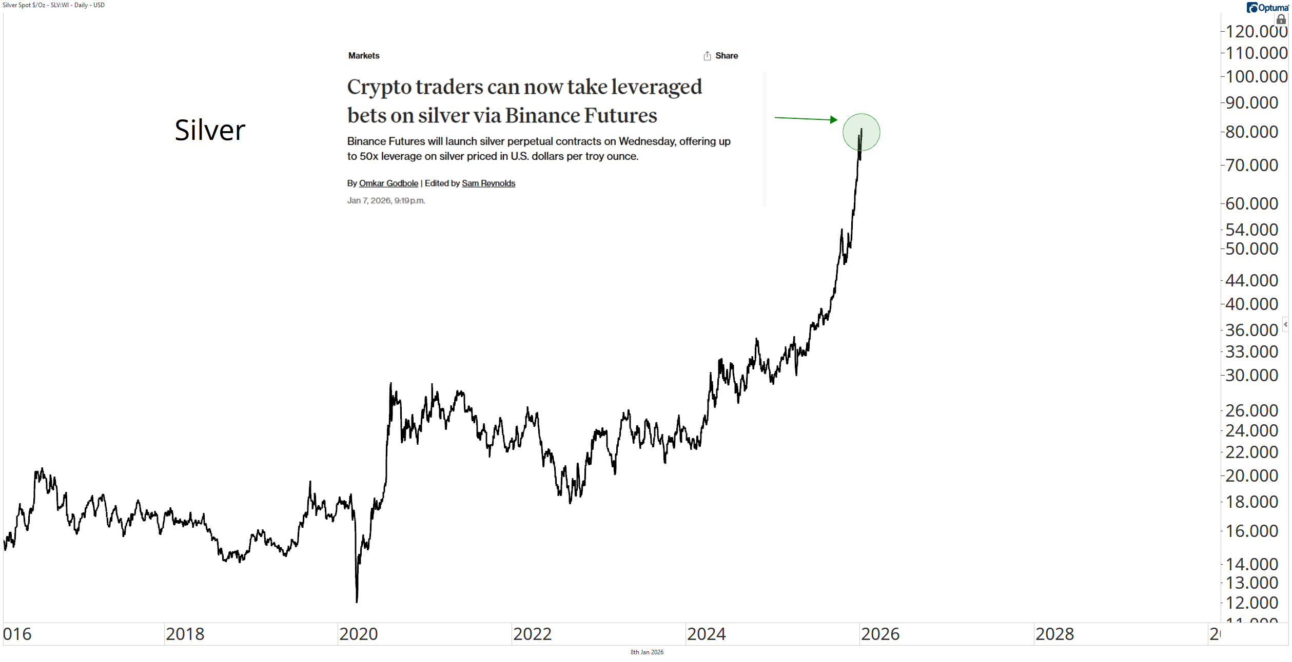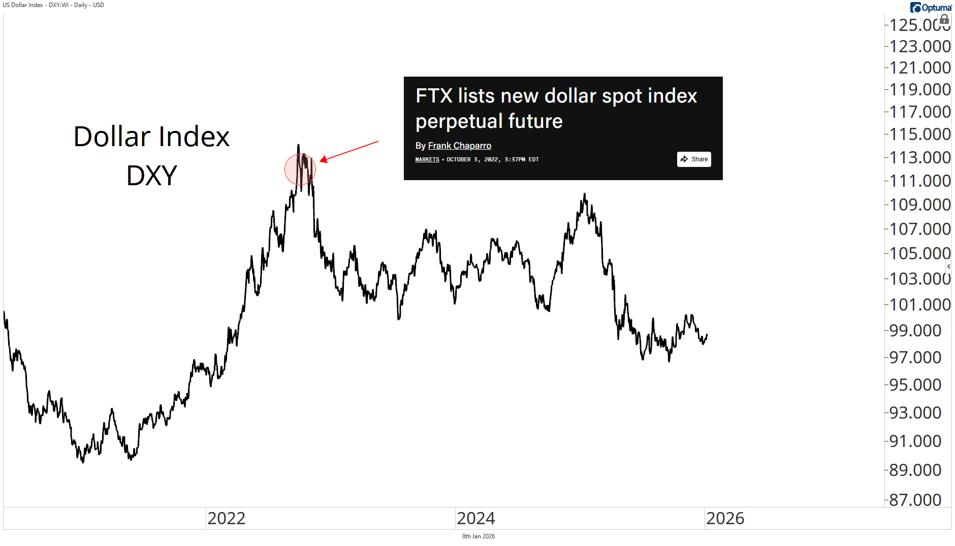 It reminds me of when the now-defunct exchange FTX launched U.S. dollar index futures in 2022, almost perfectly coinciding with the peak. The DXY hasn’t come close to those levels in the years since.