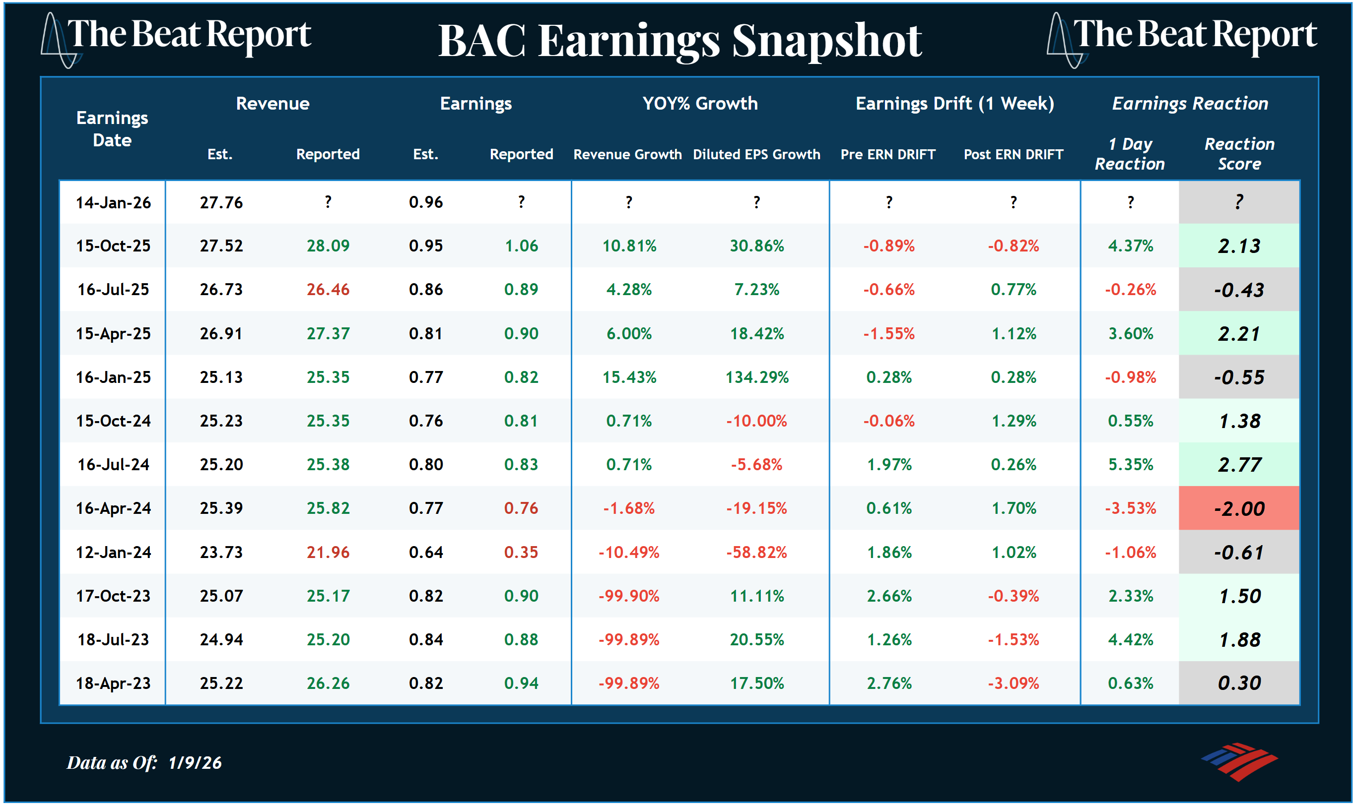 Investors are looking for $27.76B in revenue and $0.96 in EPS, and unlike JPM, the standout feature here isn’t consistency in earnings reactions but consistency in growth.