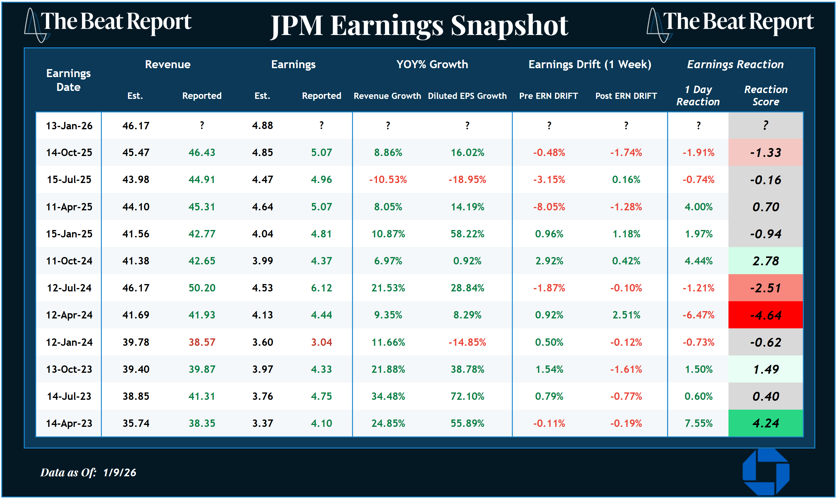 JPMorgan reports Tuesday before the open, with expectations set at $46.17B in revenue and $4.88 in earnings per share.