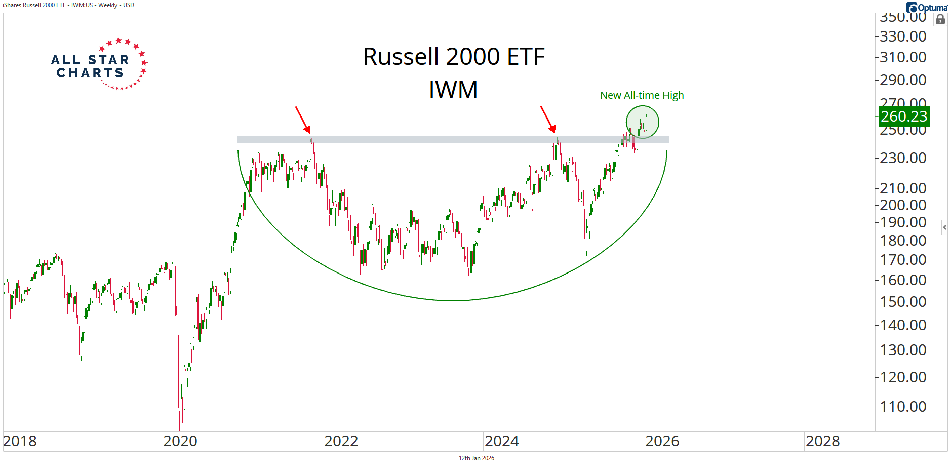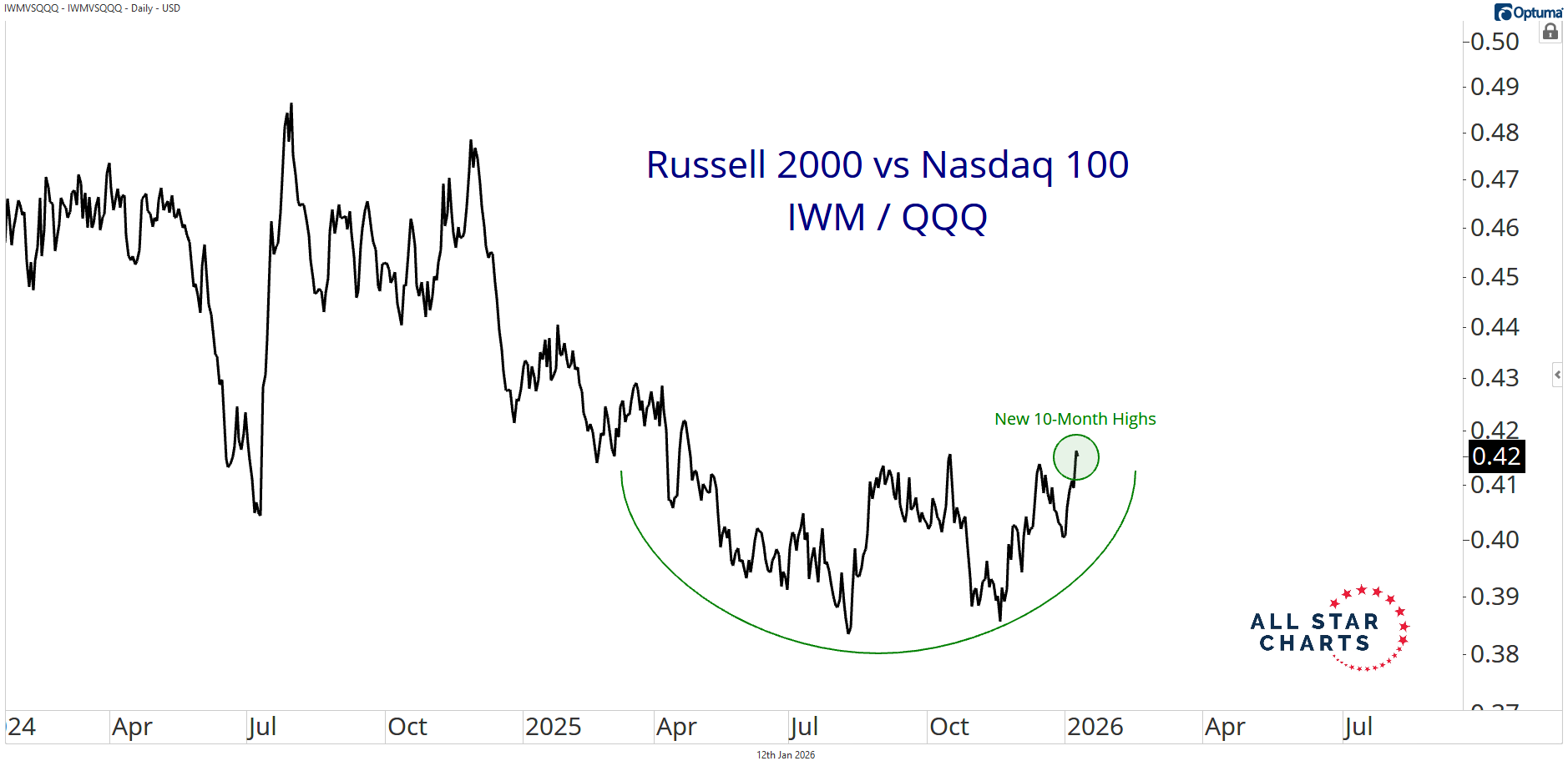 Is Small-Cap Leadership Back? By Alfonso De Pablos, CMT January 12, 2026 The little guys are back—and they’re leading the market higher.The Russell 2000 $IWM just closed the week at its highest level in its history. After nearly four years of going nowhere, it’s finally breaking out of a massive base. That kind of move doesn’t happen in a narrow market. It happens when participation is broad and leadership is rotating. And that’s exactly what we’re seeing right now.Seeing the riskiest stocks in the U.S. make new highs tells you everything you need to know about investor risk appetite. Even the relative picture confirms it: the Russell 2000 vs. Nasdaq 100 ratio is now at its highest level in 10 months. I honestly can’t think of a more bullish piece of evidence.But the real question is:Is this the start of a sustained run of outperformance for small caps over large?Are investors ready and positioned for that scenario?From where I’m sitting, the weight of the evidence suggests this is a move to take seriously. If small caps are reclaiming leadership, it could mark a meaningful opportunity for investors.We just released our latest Minor Leaguers Report: The goal here is simple: identify the strongest names while they’re still small and have serious upside potential. We’re talking up to 10x just to reach large-cap territory.Join ASC Premium to get these trades, risk-free, and be ready to position yourself for the next leg of small-cap leadership.Alfonso De Pablos, CMTDirector of Research, All Star ChartsSign up for my free daily note here. Alfonso's Daily Note Alfonso De Pablos highlights the day’s most important market-moving chart. More from Alfonso's Daily Note Alfonso De Pablos, CMT Rocks Over Stocks… For Longer? January 14, 2026 Alfonso De Pablos, CMT Dow Theory in Motion January 13, 2026 Alfonso De Pablos, CMT This Is Why I’m Still Bullish January 8, 2026 See the Chart That MattersAlfonso’s Chart of the Day highlights the setups and inflection points shaping the next big market moves — before they hit the headlines. You must have JavaScript enabled to use this form. Email Address