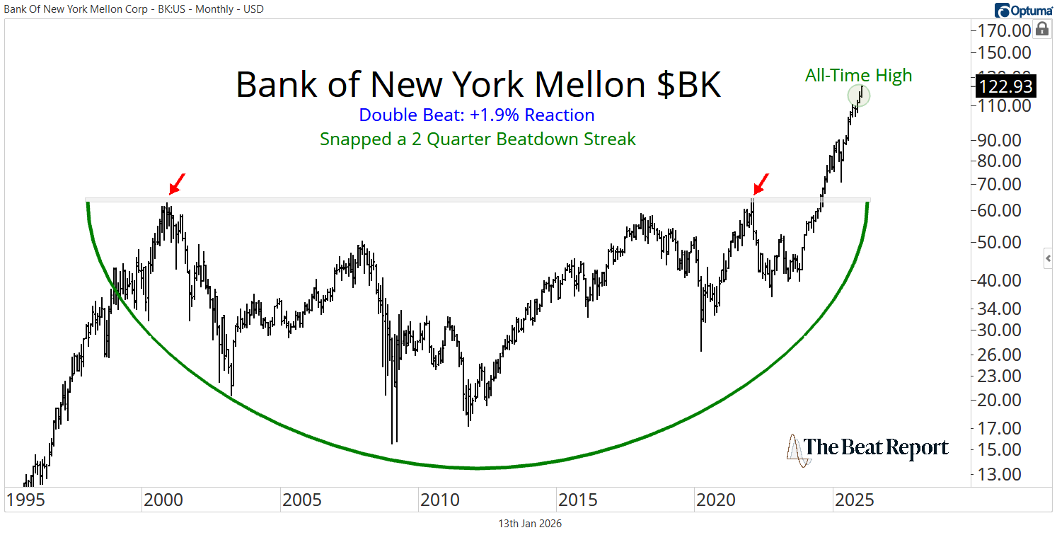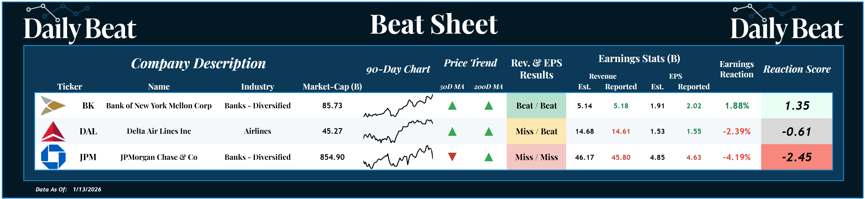 At the top of Tuesday's Beat Sheet was the $86B diversified bank, Bank of New York Mellon $BK. Following a big double beat, shareholders were rewarded with a +1.35 reaction score.