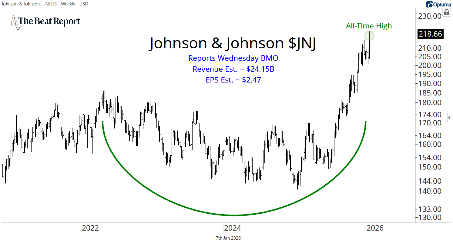 With JNJ trading at all-time highs and trend, momentum, and relative strength all aligned, the odds favor a constructive reaction if the company clears the bar.