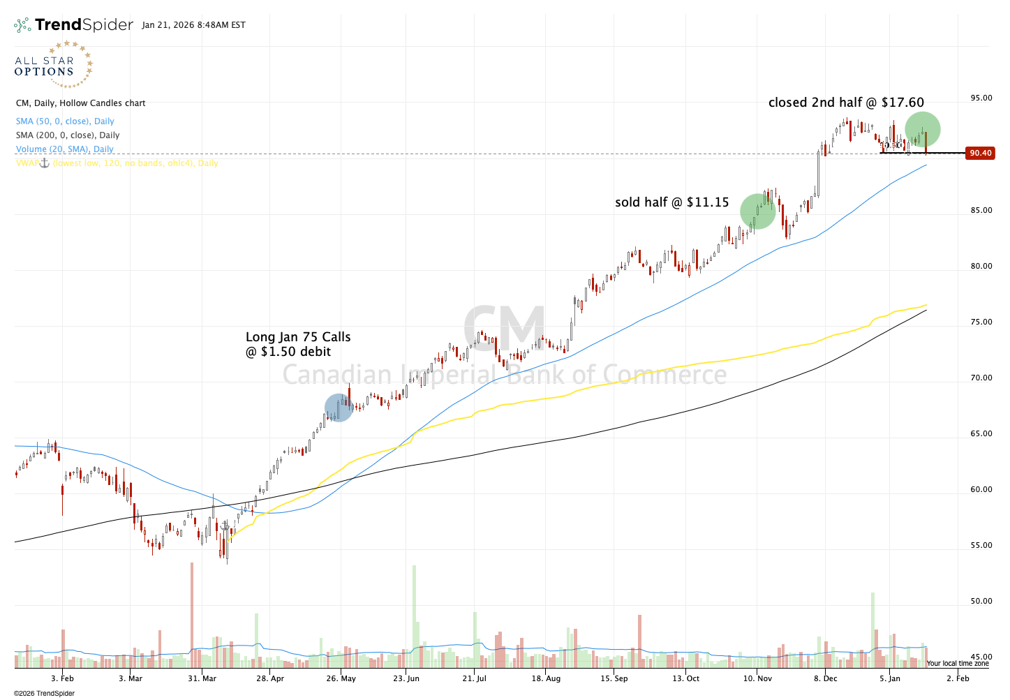 The $CM trade started with modest expectations—maybe we get to $85. It ended with the stock significantly higher than that initial target, and me holding calls to expiration day that delivered far more than I thought possible on day one.