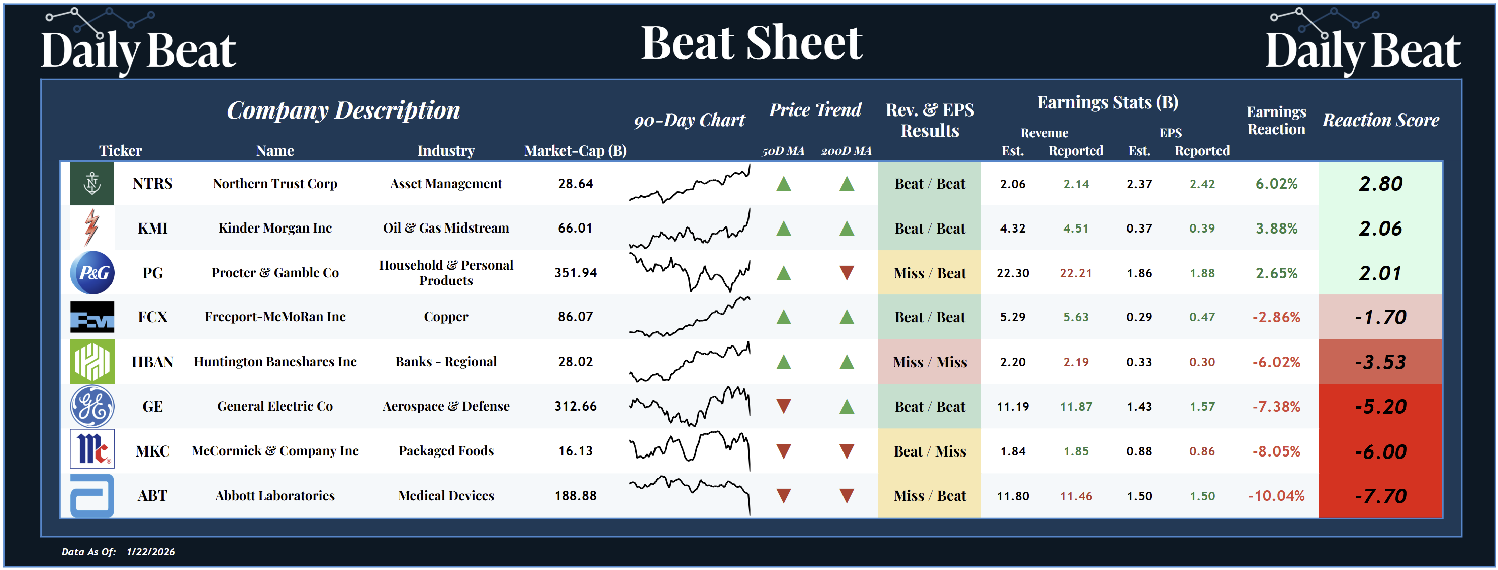 At the top of Thursday's Beat Sheet was the $28B asset management stock, Northern Trust $NTRS. Following a big double beat, shareholders were rewarded with a +2.8 reaction score.