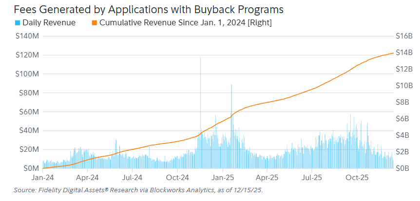 A chart from Fidelity shows that since January 2024, cryptocurrencies with buyback programs generated roughly $14 billion, most of which was distributed back to investors.