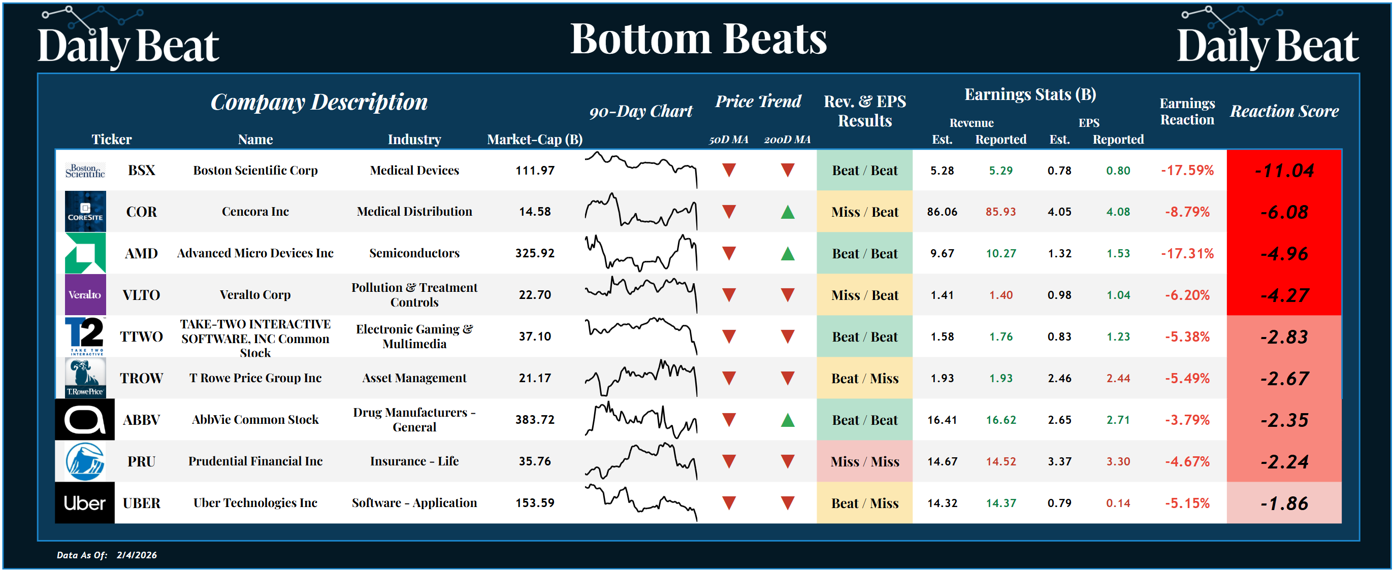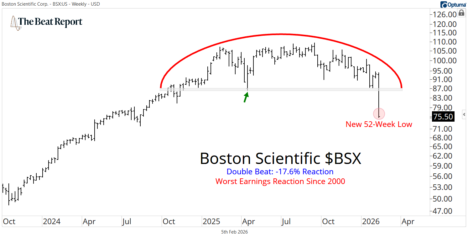 Wednesday's bottom beat came from the $112B medical devices stock, Boston Scientific $BSX. After beating headline expectations across the board, shareholders suffered a -11.04 reaction score. This was one of the biggest beat/beat/drops we've seen all season.