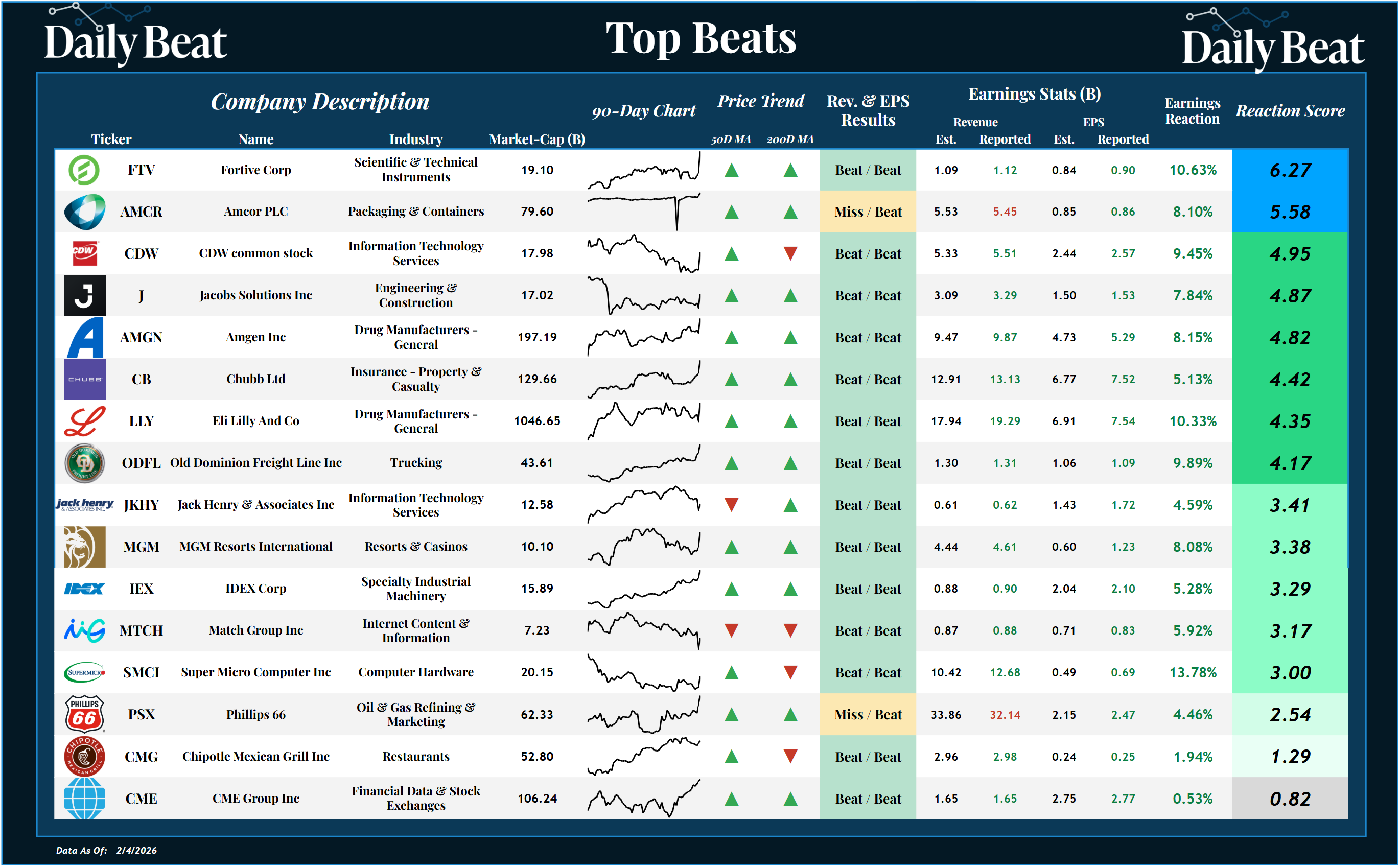Wednesday's top beat came from the $19B scientific and technical instruments stock, Fortive $FTV. After beating expectations across the board, shareholders were rewarded with a +6.27 reaction score. This was the stock's best earnings reaction ever.