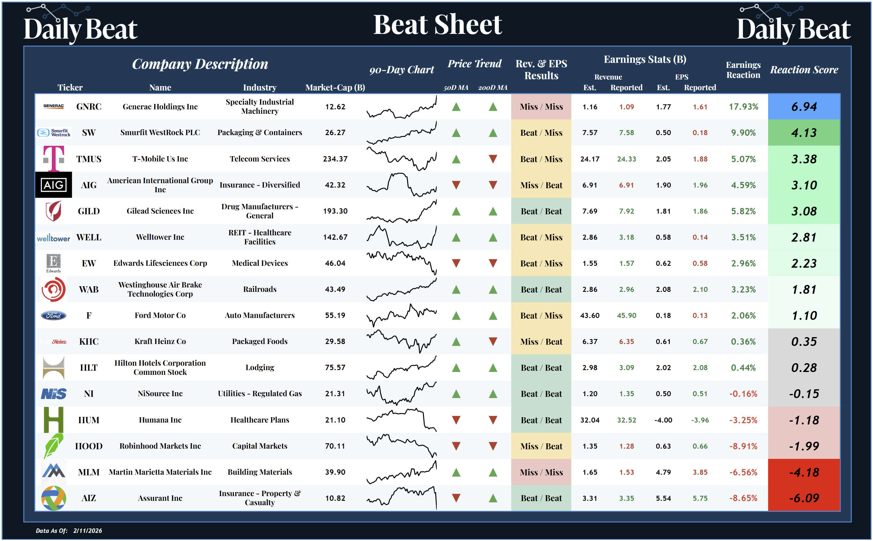 At the top of Wednesday's Beat Sheet was the $12.6B specialty industrial machinery stock, Generac $GNRC. Despite missing expectations across the board, shareholders were rewarded with a +6.94 reaction score.