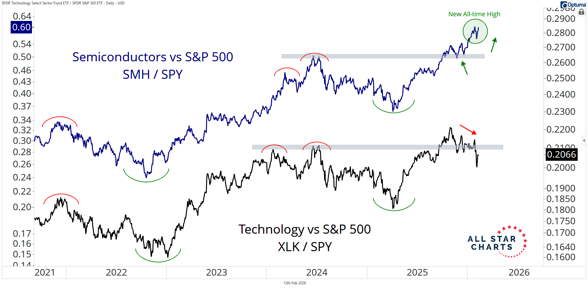 Here, we’re tracking Technology and Semiconductors, each relative to the S&P 500: