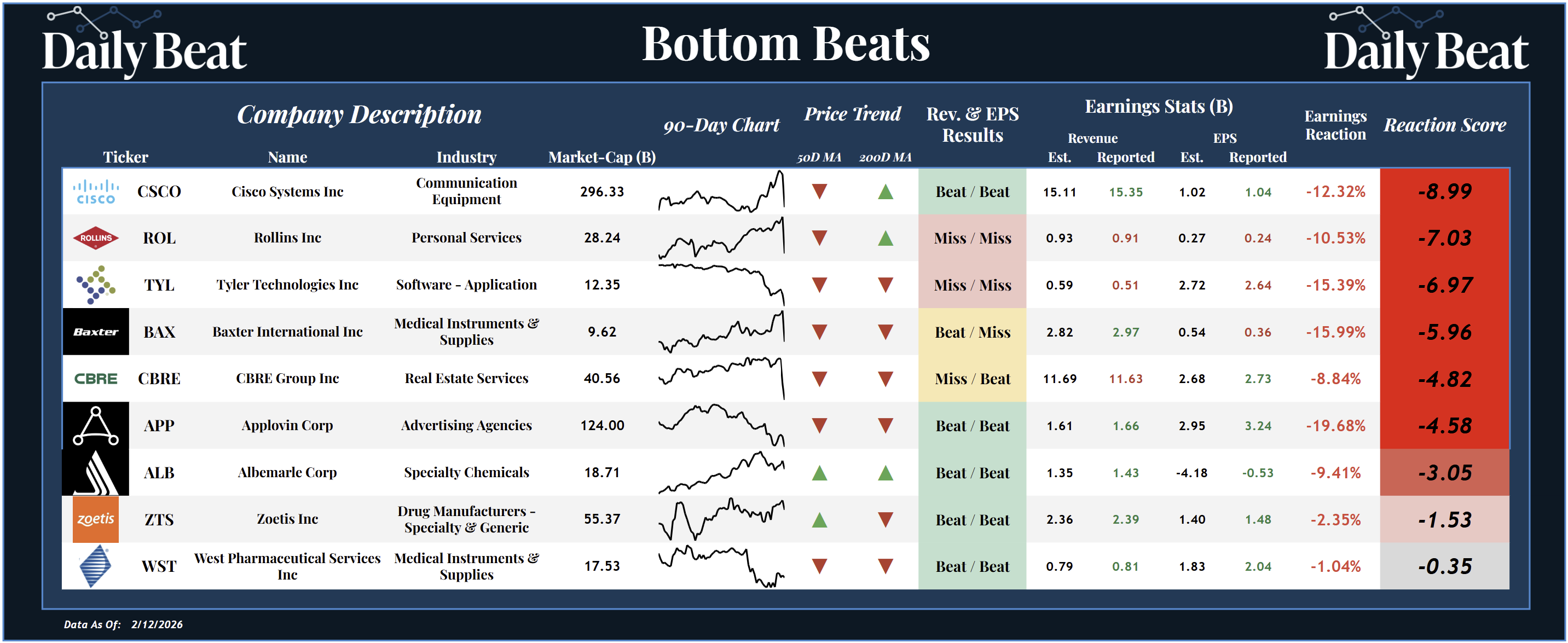 Thursday's bottom beat came from the $296B communication equipment stock, Cisco Systems $CSCO. Despite a big double beat, shareholders suffered a -8.99 reaction score.