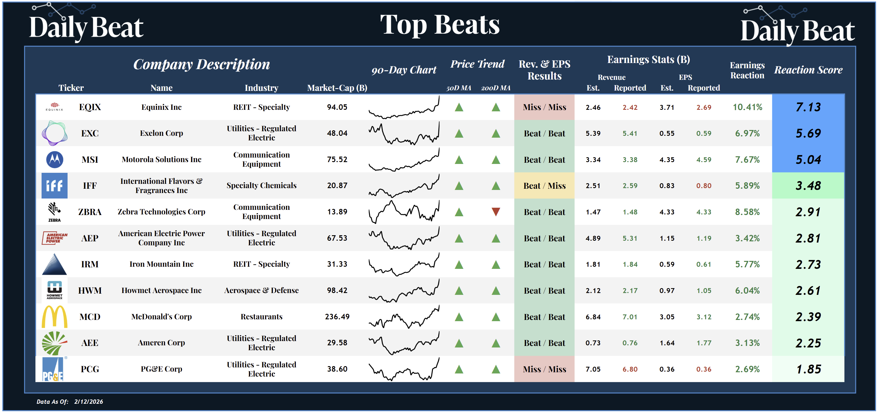 Thursday's top beat came from the $94B specialty REIT stock, Equinox $EQIX. After missing headline expectations, shareholders were rewarded with a +7.13 reaction score.