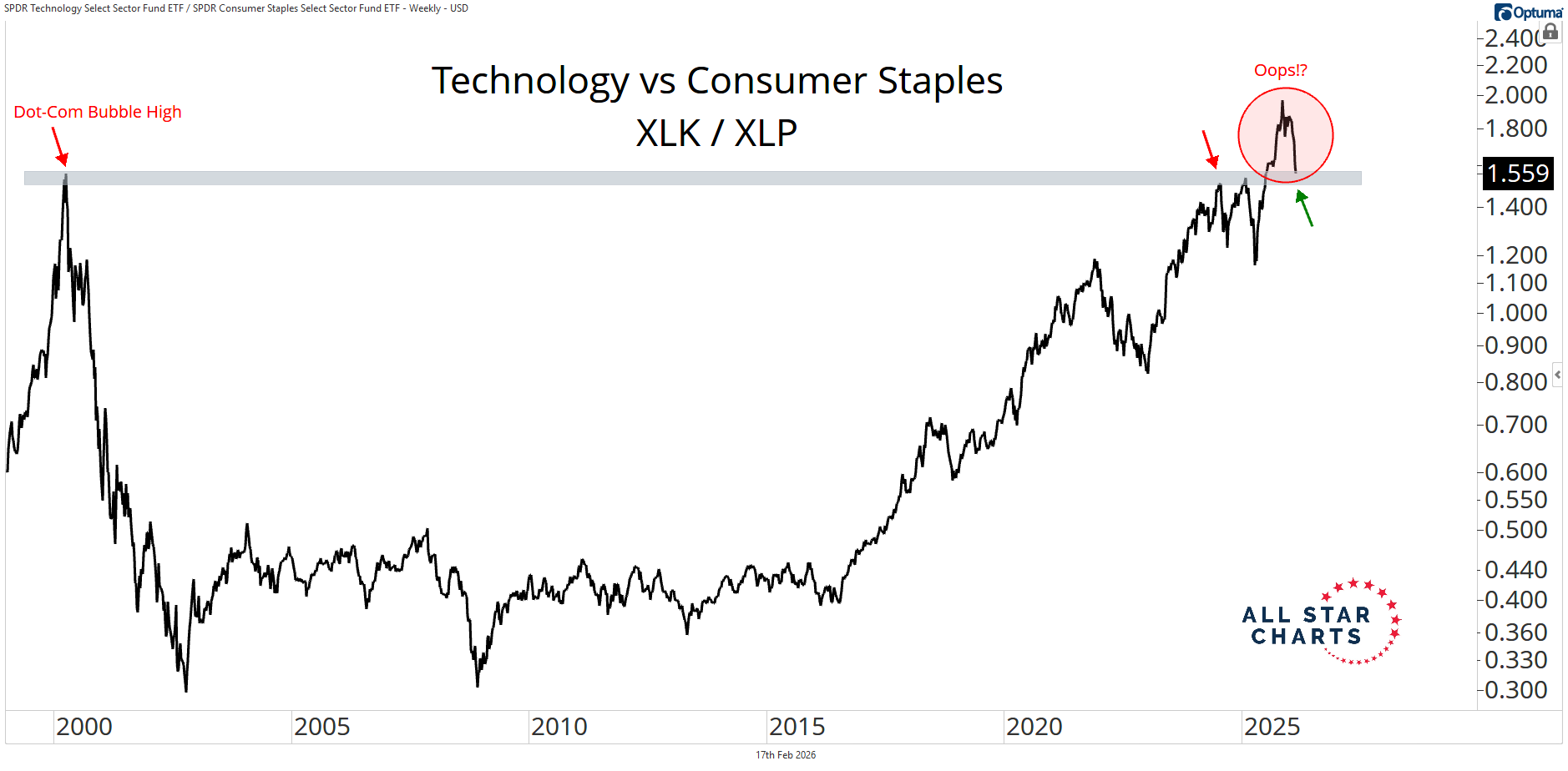 Last year, the XLK/XLP ratio completed a massive base and broke out. Now, it’s pulling back into former resistance — a key polarity zone that stretches back to the dot-com bubble.