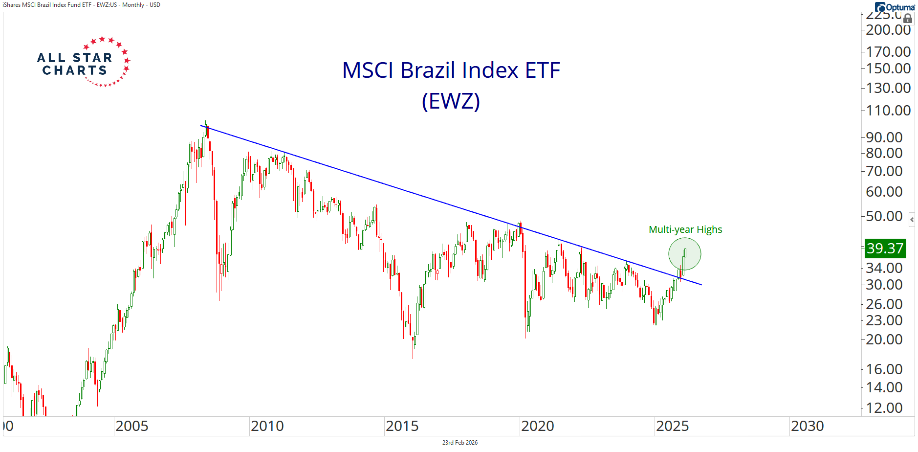 Bullish Opportunities in Brazil By Alfonso De Pablos, CMT February 23, 2026 The opportunity in global equities is becoming clearer by the day.After a long period of underperformance and being overlooked, markets outside the U.S. are starting to look attractive again — even if many investors remain skeptical.This shift is showing up in the flow of capital.Lately, money has been rotating into Emerging Markets — some of the riskiest regions in the world.Within that landscape, Latin America is gaining attention, and Brazil in particular is emerging as a standout opportunity,Brazil’s equity market mirrors its resource-driven economy, with Materials, Energy, and Financials leading the charge.Beneath the surface, a growing group of fintech and speculative tech names is quietly gaining traction,It’s a surprisingly diversified opportunity set.The MSCI Brazil ETF $EWZ is now breaking out above a 15+ year downtrend line. While I’m not usually a trendline guy, this breakout looks decisive.With broader participation improving, the setup is starting to look meaningful.On a relative basis, Brazil also looks constructive, as we see mounting evidence that the country could be turning the corner.EWZ has reclaimed a major support zone relative to international stocks — the same area that marked the 2016 and 2022 lows. I can’t think of a better place for Brazilian equities to assume a leadership role.We just released a deep dive on Brazil, outlining four new trade ideas across different equity vehicles. You can read the full report here.Alfonso De Pablos, CMTDirector of Research, All Star ChartsSign up for my free daily note here. Alfonso's Daily Note Alfonso De Pablos highlights the day’s most important market-moving chart. More from Alfonso's Daily Note Alfonso De Pablos, CMT Catching A Falling Knife In Software February 26, 2026 Alfonso De Pablos, CMT Two Divergences That Matter February 24, 2026 Alfonso De Pablos, CMT ARKK at Decision Time February 19, 2026 See the Chart That MattersAlfonso’s Chart of the Day highlights the setups and inflection points shaping the next big market moves — before they hit the headlines. You must have JavaScript enabled to use this form. Email Address