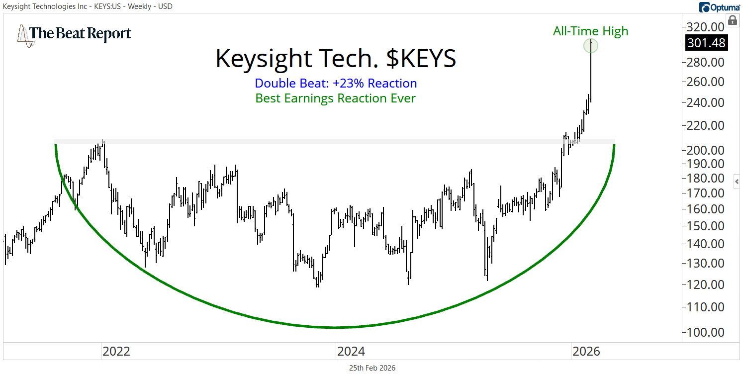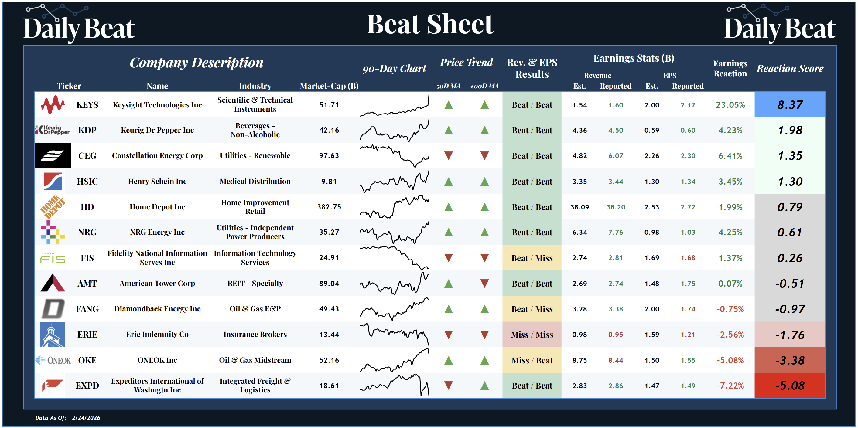 At the top of Tuesday's Beat Sheet was the $52B scientific & technical instruments stock, Keysight Technologies $KEYS. Following a big double beat, shareholders were rewarded with a +8.37 reaction score. This was one of the highest reaction scores we've seen all earnings season.