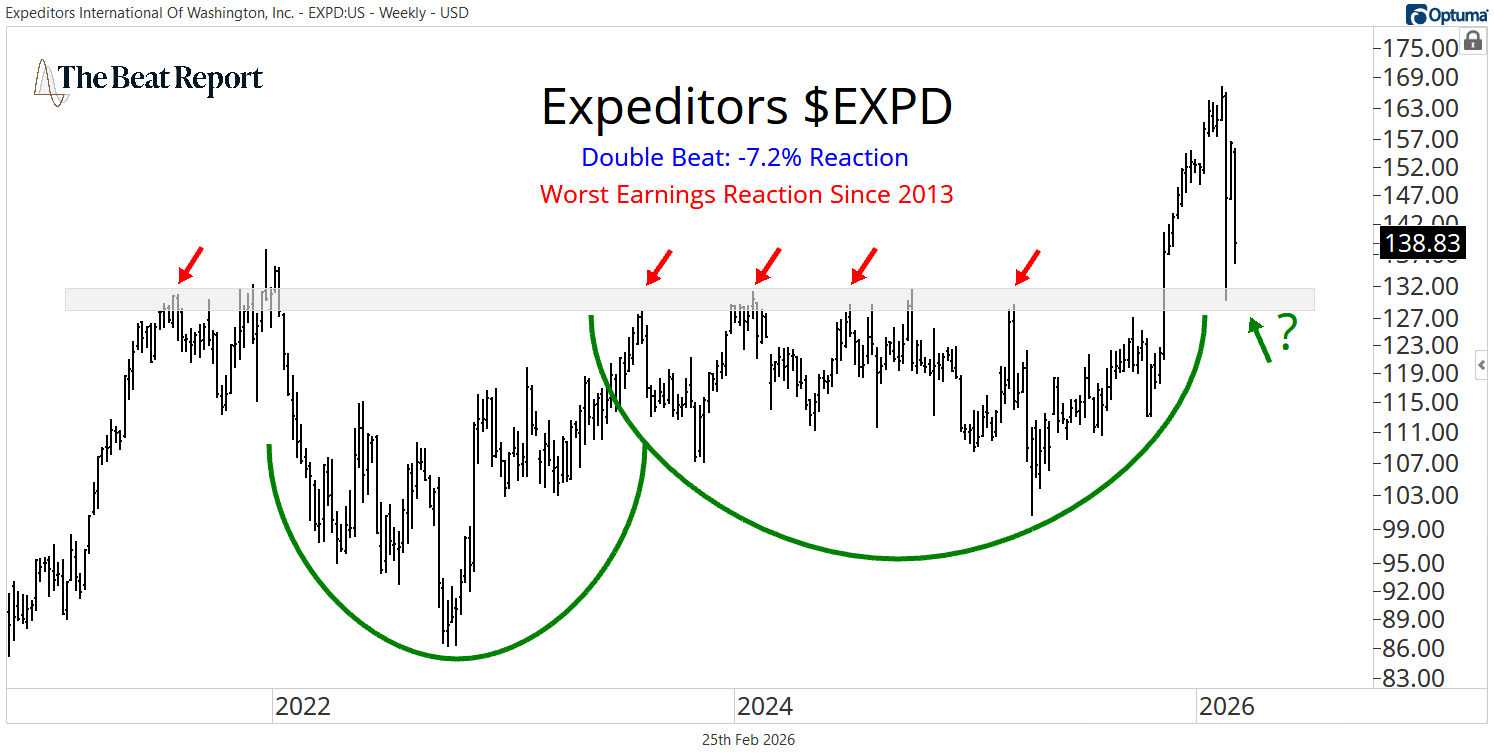 At the bottom of Tuesday's list was the $18B integrated freight & logistics stock, Expeditors $EXPD. After reporting better-than-expected headline results, shareholders received a -5.08 reaction score. This was one of the nastiest beat/beat/drops we've seen all earnings season.