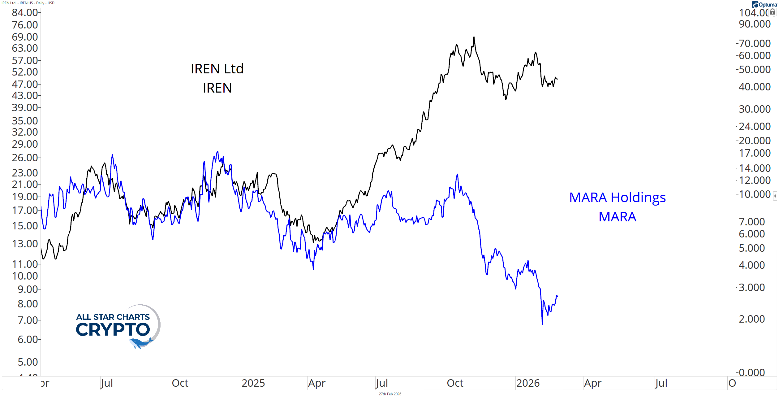 MARA watched all of this from the sidelines and their stock price suffered. Just look at this brutal comparison of IREN and MARA while this has been happening.