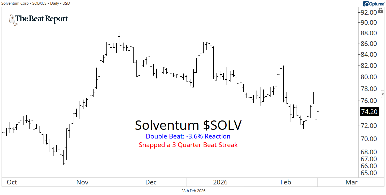 At the bottom of Friday's list was the $13B health information services stock, Solventum $SOLV. After reporting better-than-expected headline results, shareholders received a -1.64 reaction score.