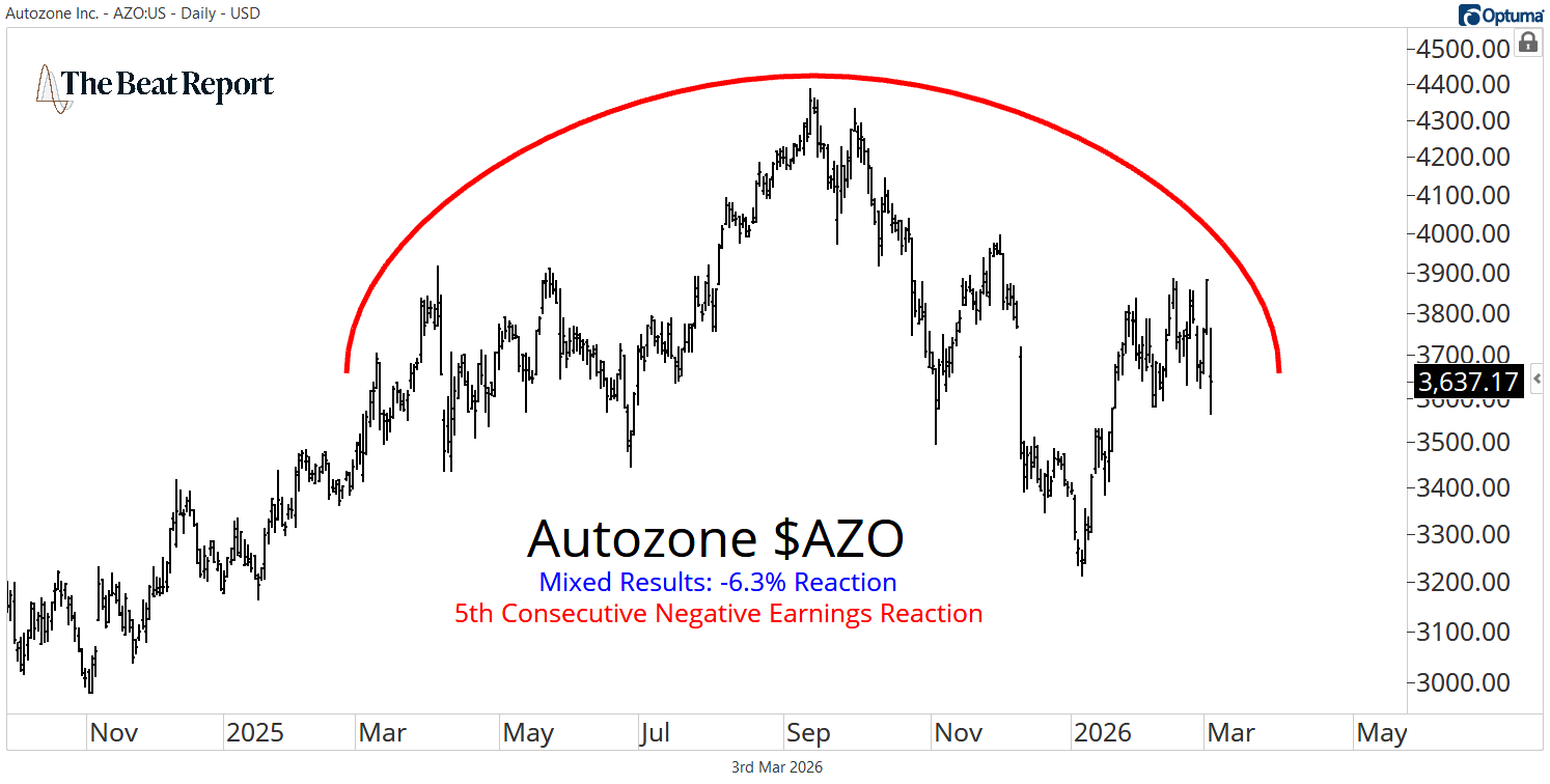 At the bottom of Tuesday's list was the $61B specialty retail stock, AutoZone $AZO. After posting mixed earnings results, shareholders received a -3.54 reaction score.