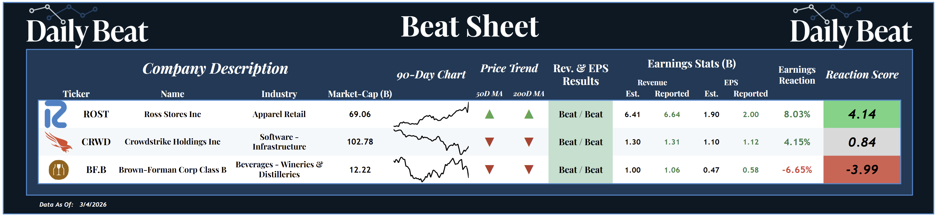 At the top of Wednesday's Beat Sheet was the $69B apparel retail stock, Ross Stores $ROST. Following a big double beat, shareholders were rewarded with a +4.14 reaction score.