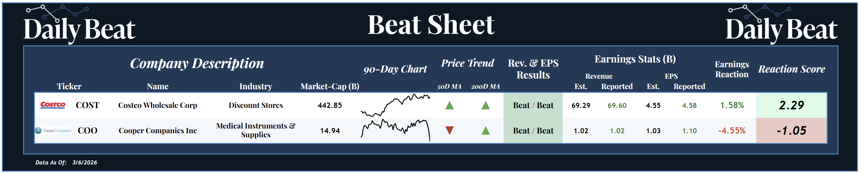 At the top of Friday's Beat Sheet was the $443B discount store stock, Costco $COST. Following a better-than-expected earnings report, shareholders were rewarded with a +2.29 reaction score.