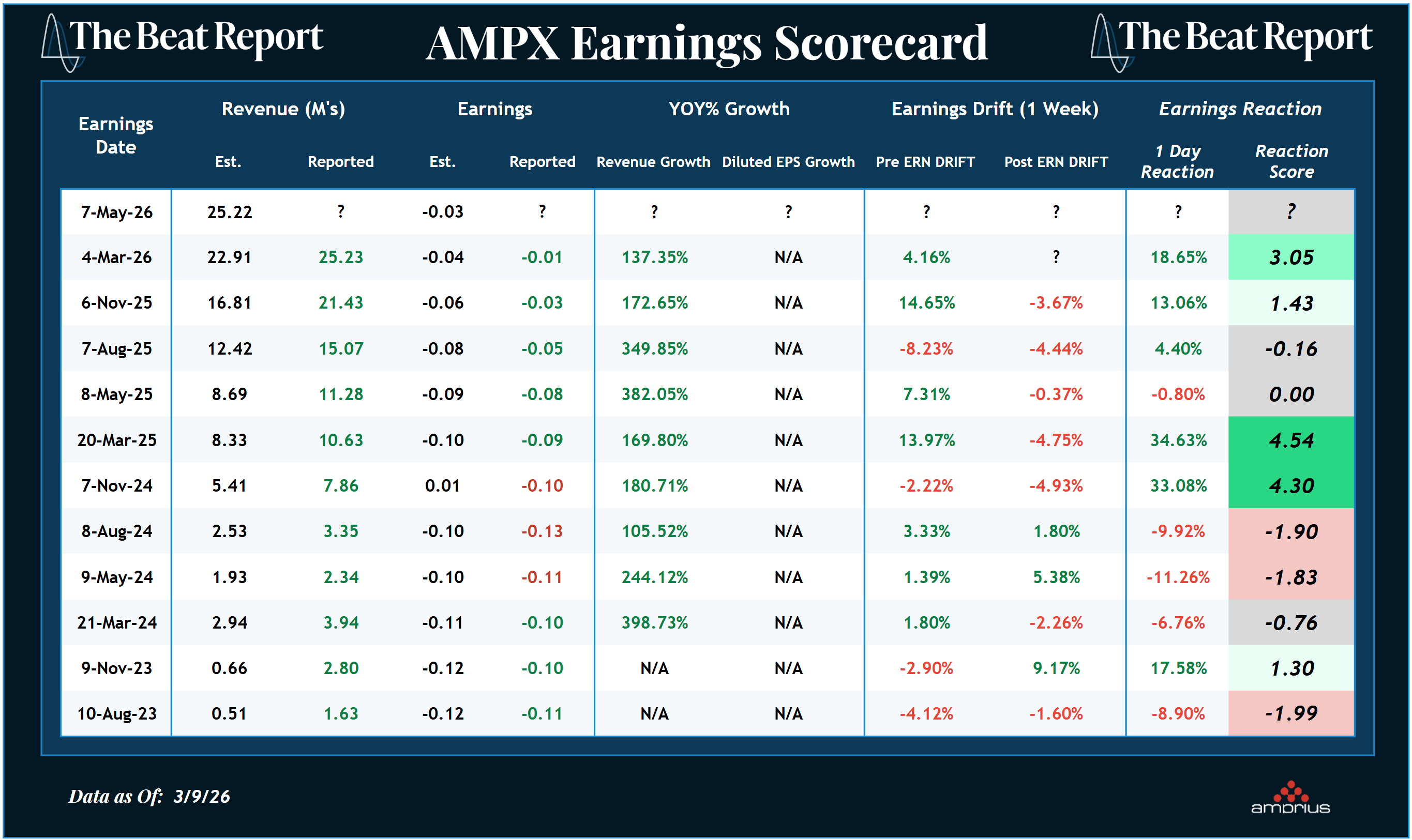 In November of that year, AMPX delivered a +33% earnings reaction, the largest in the company’s history. That move marked a clear turning point in the market's response to the company’s results.