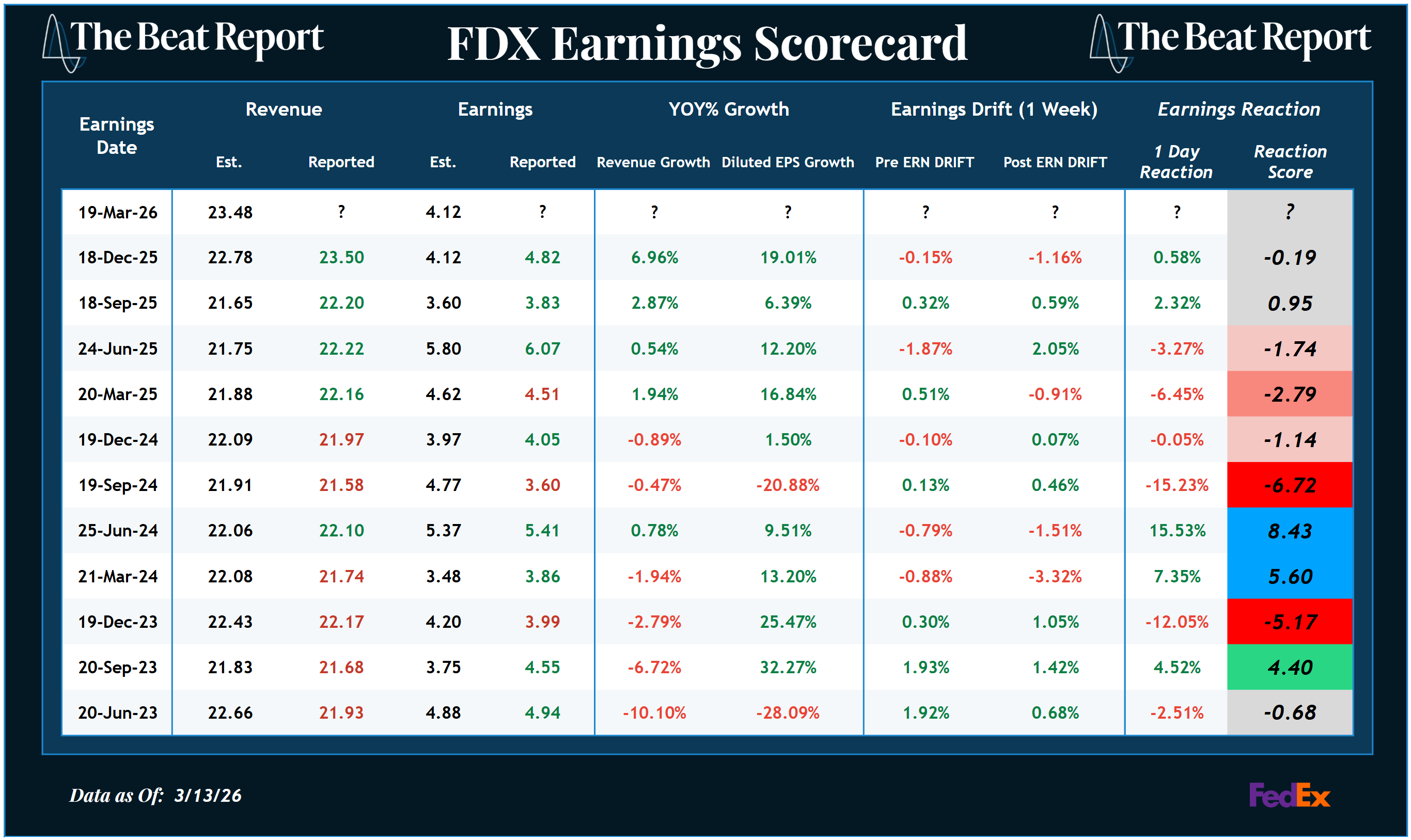 FedEx has been rewarded for the last two earnings reports after suffering four consecutive negative reactions before that.