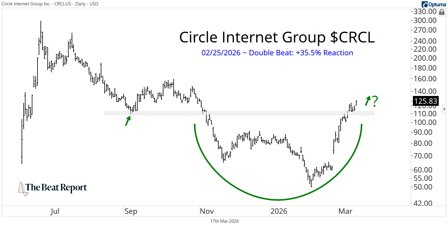 The Infrastructure Behind Internet Money Circle’s USDC growth is exploding, and the stock is following. March 17, 2026 There were no S&P 500 earnings reactions on Monday, but we want to tell you about a stock outside of the S&P 500 that has our attention.This is Circle Internet Group $CRCL, and the stock is back in a big way.After an 80%+ post-IPO drawdown, the stock has completely flipped the script, ripping higher on the back of a monster earnings report.On February 25, CRCL delivered a double beat and rallied +35.5% for its best reaction ever.And the fundamentals are just as strong as the price action.Circle, the company behind USDC, is building the infrastructure for internet-native money, and adoption is accelerating fast.USDC in circulation grew 72% year-over-year to $75.3B, while transaction volume surged 247% to $11.9T.Revenue jumped 77%, and EBITDA exploded 412%, showing the kind of operating leverage you get from a scaling network.This isn’t just crypto hype, it’s real usage, with partners like Visa and Intuit integrating USDC into real-world payments. Since bottoming in early February, the stock is up ~150% and is now reclaiming a key polarity level.That’s a major shift in character.You’ve got a huge earnings reaction, strong fundamentals, and a clean primary trend reversal, all lining up at once.That’s how new uptrends begin.These are the kinds of setups we’re tracking every week.Inside the Premium Beat Report, we break down the stocks with the strongest reactions, cleanest trends, and biggest opportunities ahead.If you want to catch moves like this early, that’s where to look.We hope you enjoyed this post,-The Beat Team P.S. Are you looking for the next explosive growth story in crypto?You need to see what Louis is doing at All Star Chart Crypto. Daily Beat Steve Strazza highlights stocks showing both fundamental strength and technical momentum. More from Daily Beat A Tale of Two Earnings Reactions One company is stabilizing. The other is still in freefall, and the market knows it. March 19, 2026 This Is the Trade Around Earnings This Week A high-growth name is coiled for a breakout as the market bets on strength in memory. March 18, 2026 When Earnings Don’t Matter Adobe beat expectations and got crushed. Lennar missed and rallied. March 16, 2026 Trade With StrengthThe Daily Beat spots fundamentally strong stocks showing real momentum — a daily list built for traders who act on strength, not noise. You must have JavaScript enabled to use this form. Email Address More from The Beat Report The Beat Report Join Today