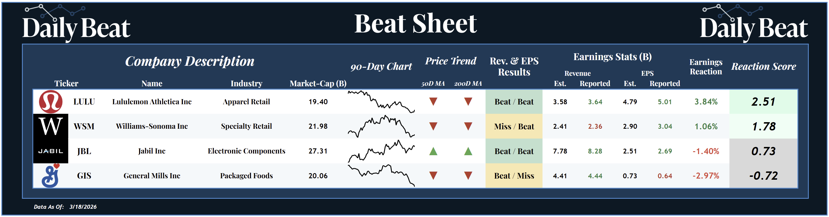 Lululemon $LULU led the board with the strongest reaction and reaction score, rallying +3.8% after a clean double beat. That marks its second consecutive positive earnings reaction.