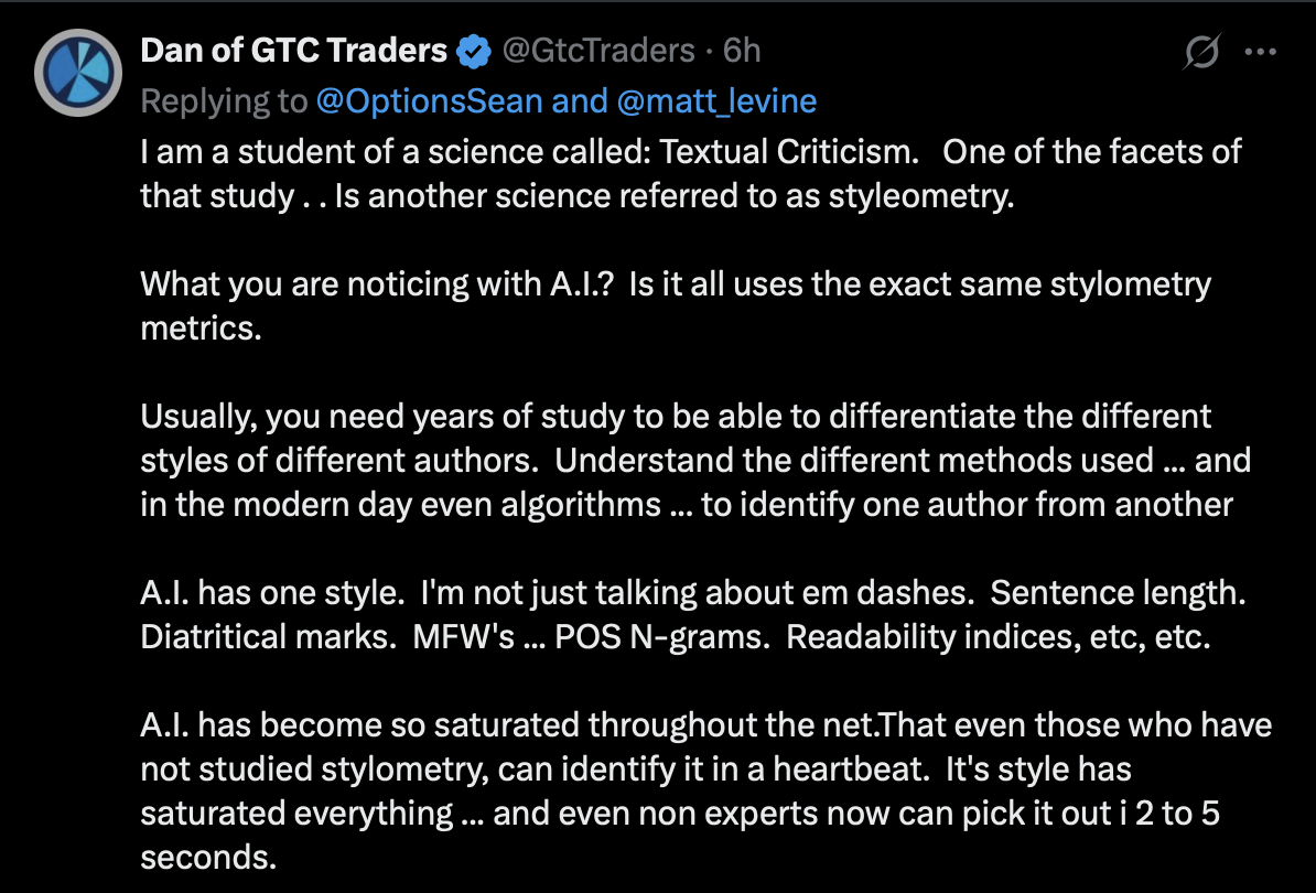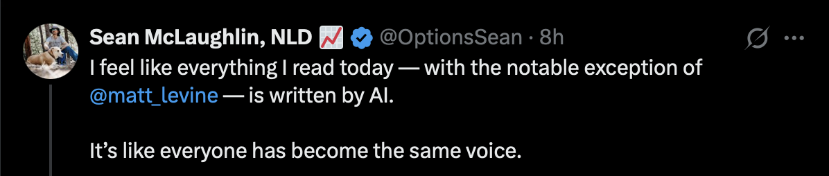 When I returned from my retreat, I found myself trying to catch up with all the trading, research, and mindset content that I either subscribe to or scroll through on a regular basis. And in doing so, I was struck by how similar every.single.thing reads these days. It became immediately clear to me that all I'm doing is reading AI-generated content. Content that has no soul. Sure, much of it is factually correct, but it has no spirit behind it. It reads like its from someone who doesn't have any skin in the game.