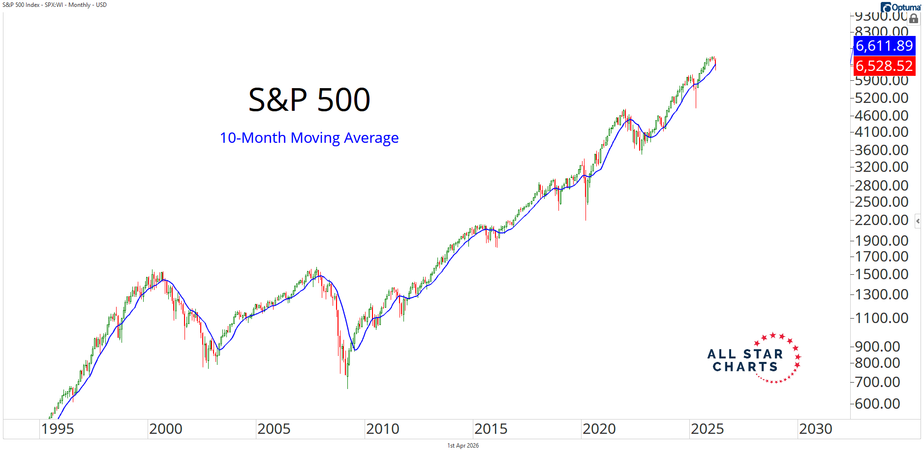 You take a 10-month moving average of the S&P 500, and at the end of each month, if the price closes above it, you own stocks. If it closes below, you reduce risk, or simply step aside.
