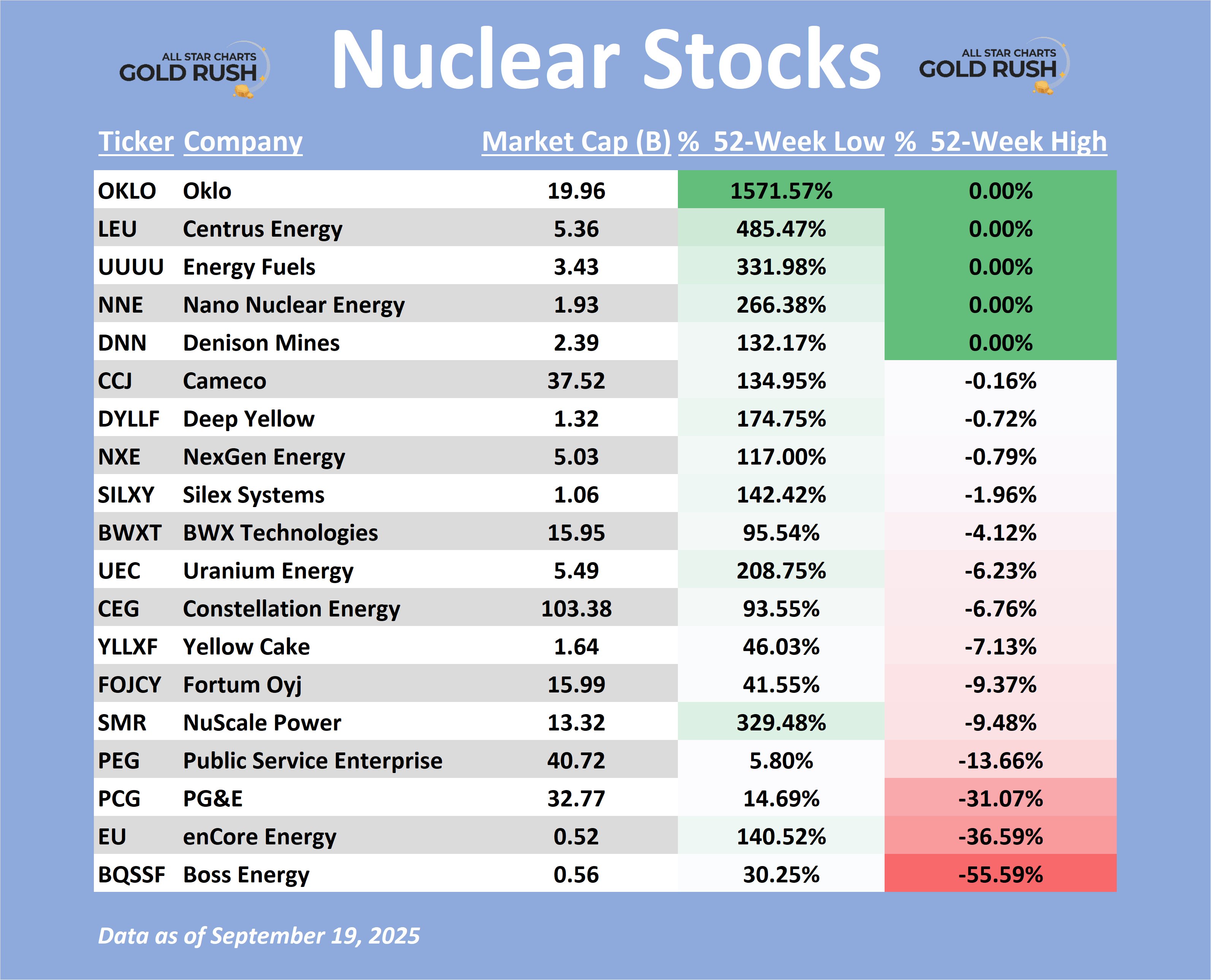 This table includes the components of the VanEck Uranium & Nuclear Energy ETF, filtered by proximity to 52-week highs. We've also included the distance from 52-week lows.