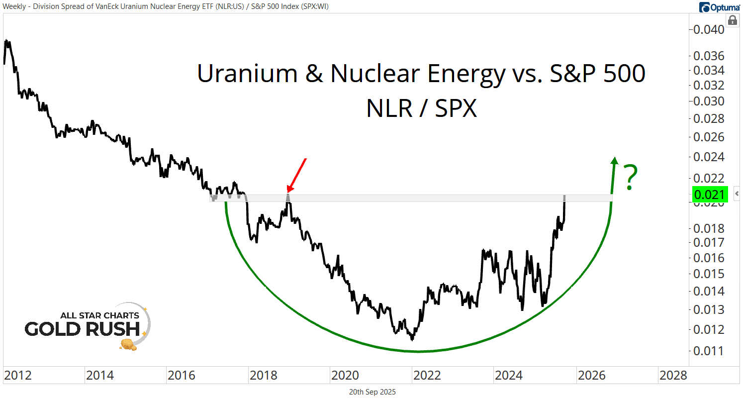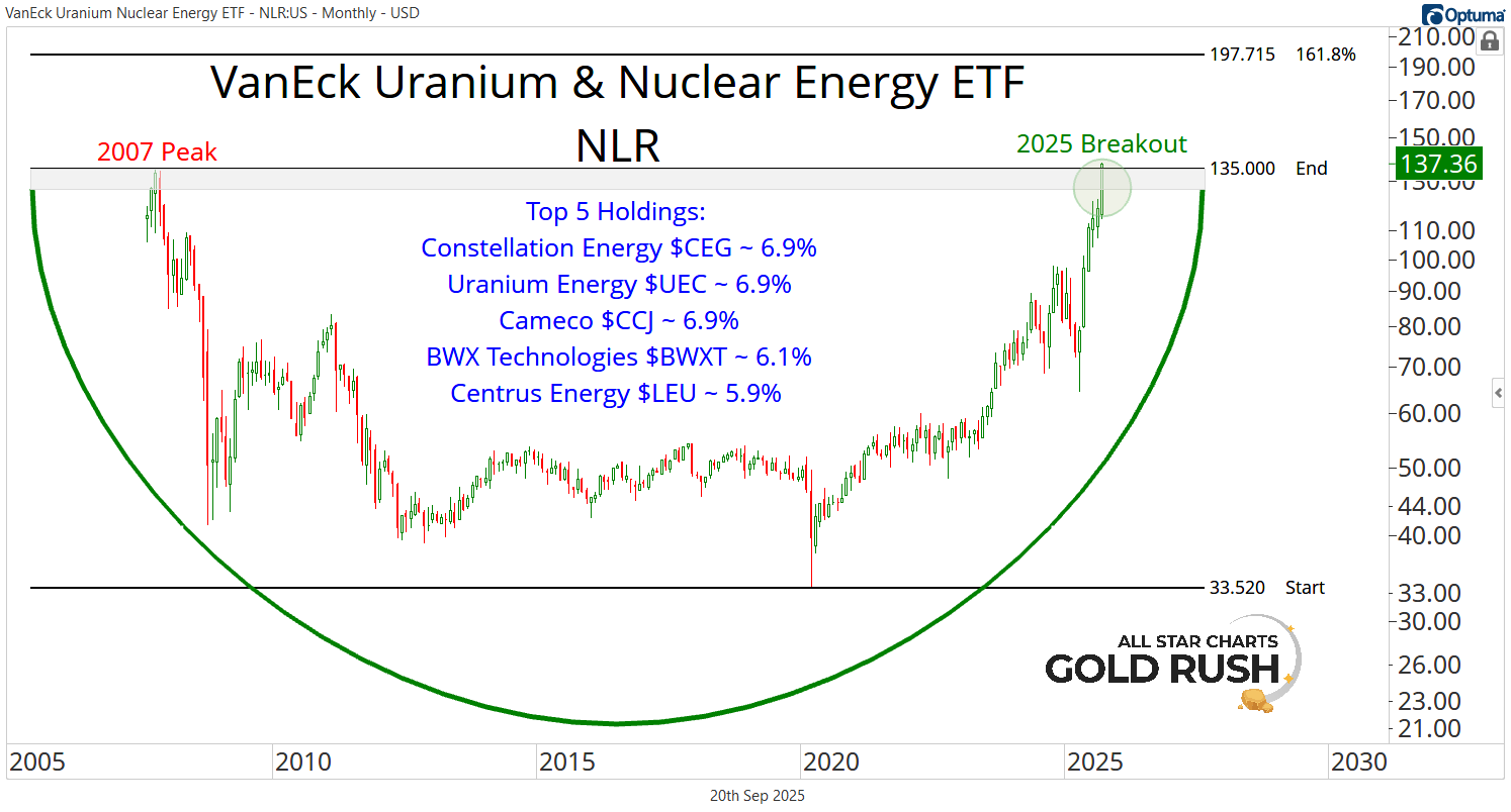 In absolute terms, the VanEck Uranium & Nuclear Energy ETF has carved out a multi-decade accumulation pattern, dating back to the 2007 peak.