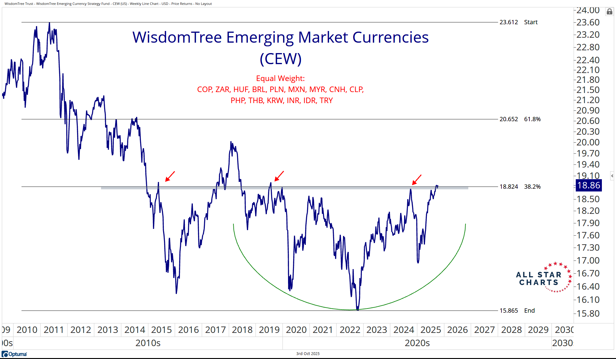 The cleanest confirmation comes from the Emerging Currency Fund $CEW—an equal-weight basket of 15 EM currencies versus the dollar from our friends over at WisdomTree.