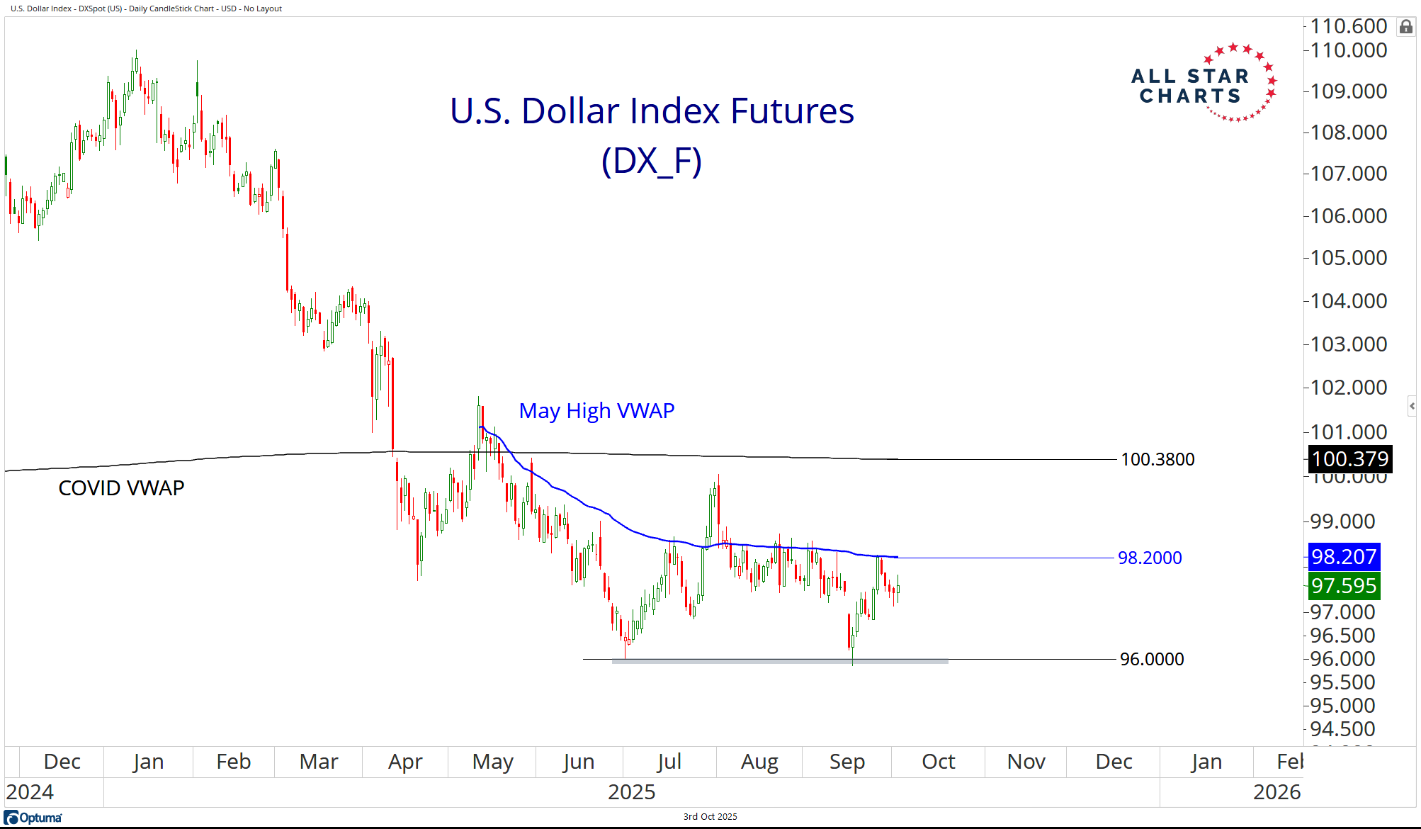 First is 98.20, the May high VWAP. Every rally attempt since has stalled there. Above it, the dollar still has to wrestle with the COVID VWAP near 100.