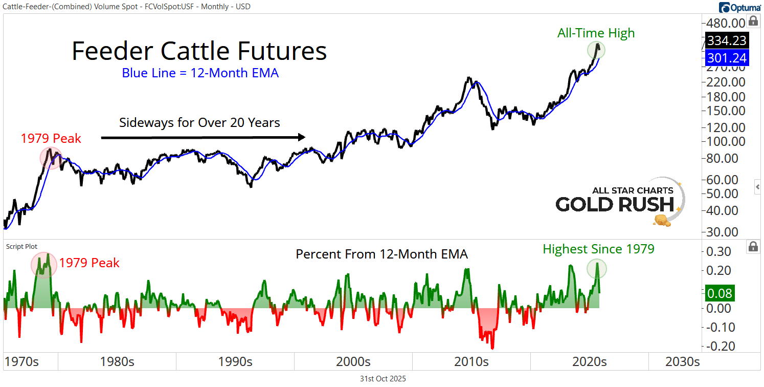 Feeder cattle prices reached all-time highs this year, stretching farther above their 12-month EMA than at any point since 1979.