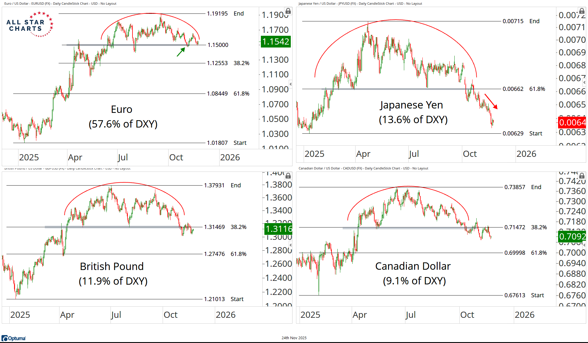 Under the hood, major currencies have been weakening against the Dollar for months. EUR and GBP are the sturdier pairs, CAD is slipping, and JPY—true to form—remains the weakest link.