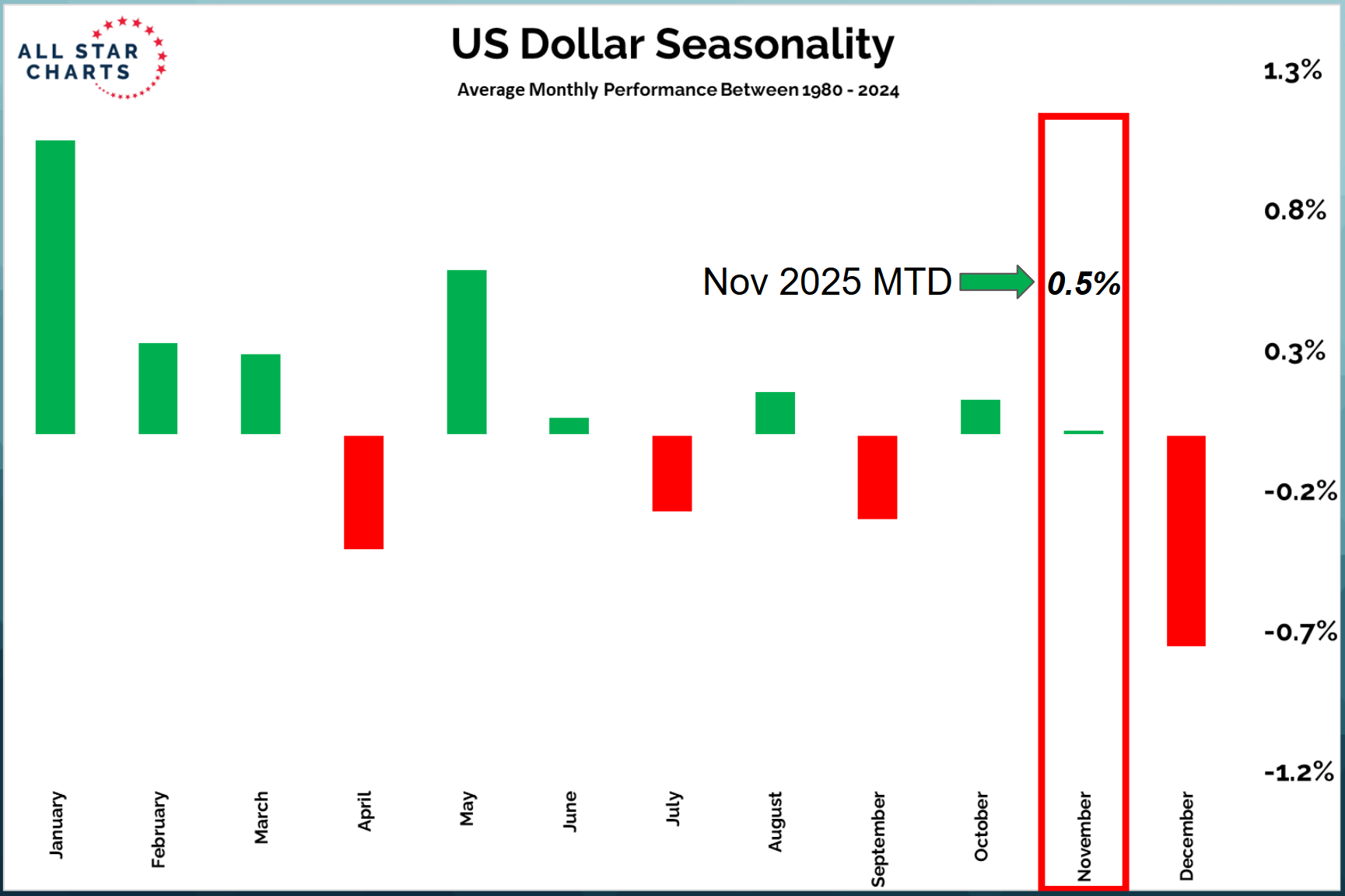 November is running hotter than usual for the US Dollar Index $DXY. Seasonally, the buck tends to cool into year-end, yet this month it’s been firmer than the historical script, up around 50 basis points over its average.