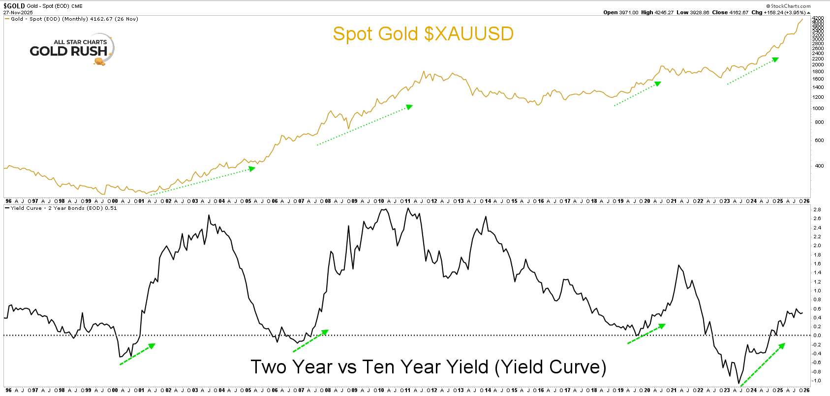 Gold and silver aren’t moving because someone tweeted about it. They’re moving because the yield curve has begun a bull steepening — a classic early-cycle liquidity signal.