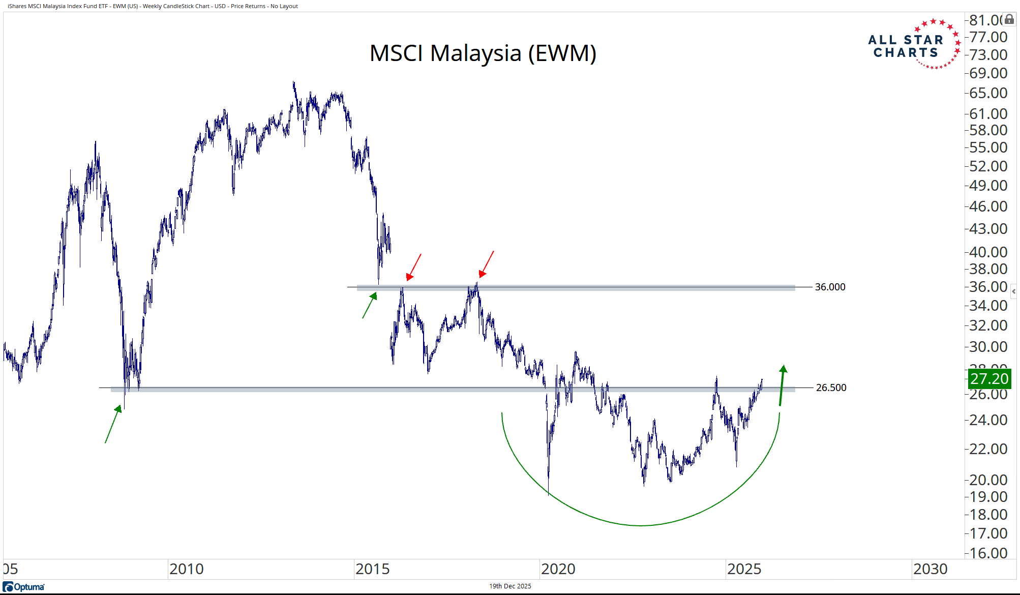 EWM just cleared a decade-long polarity shelf near 26.50, completing a five-year bottoming formation.