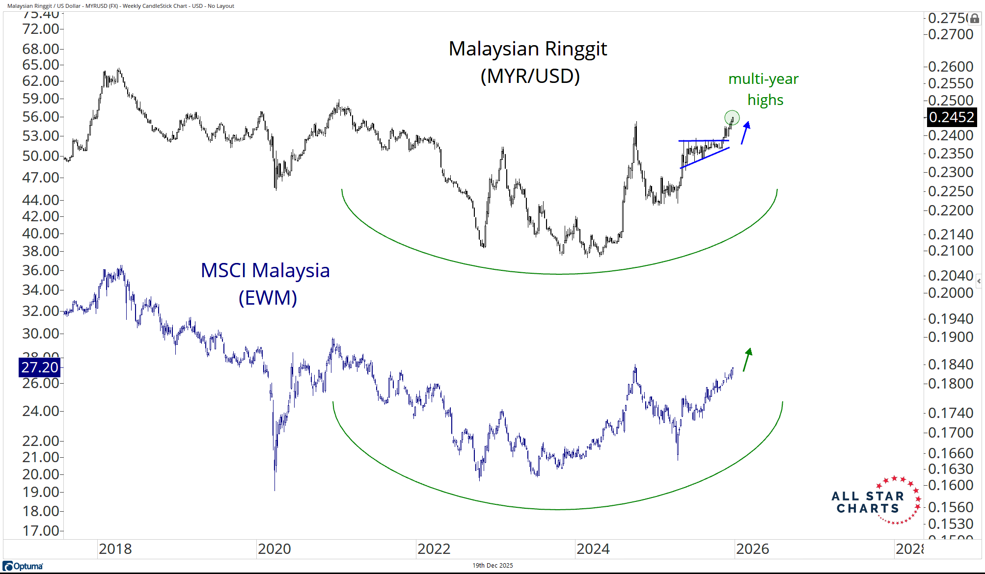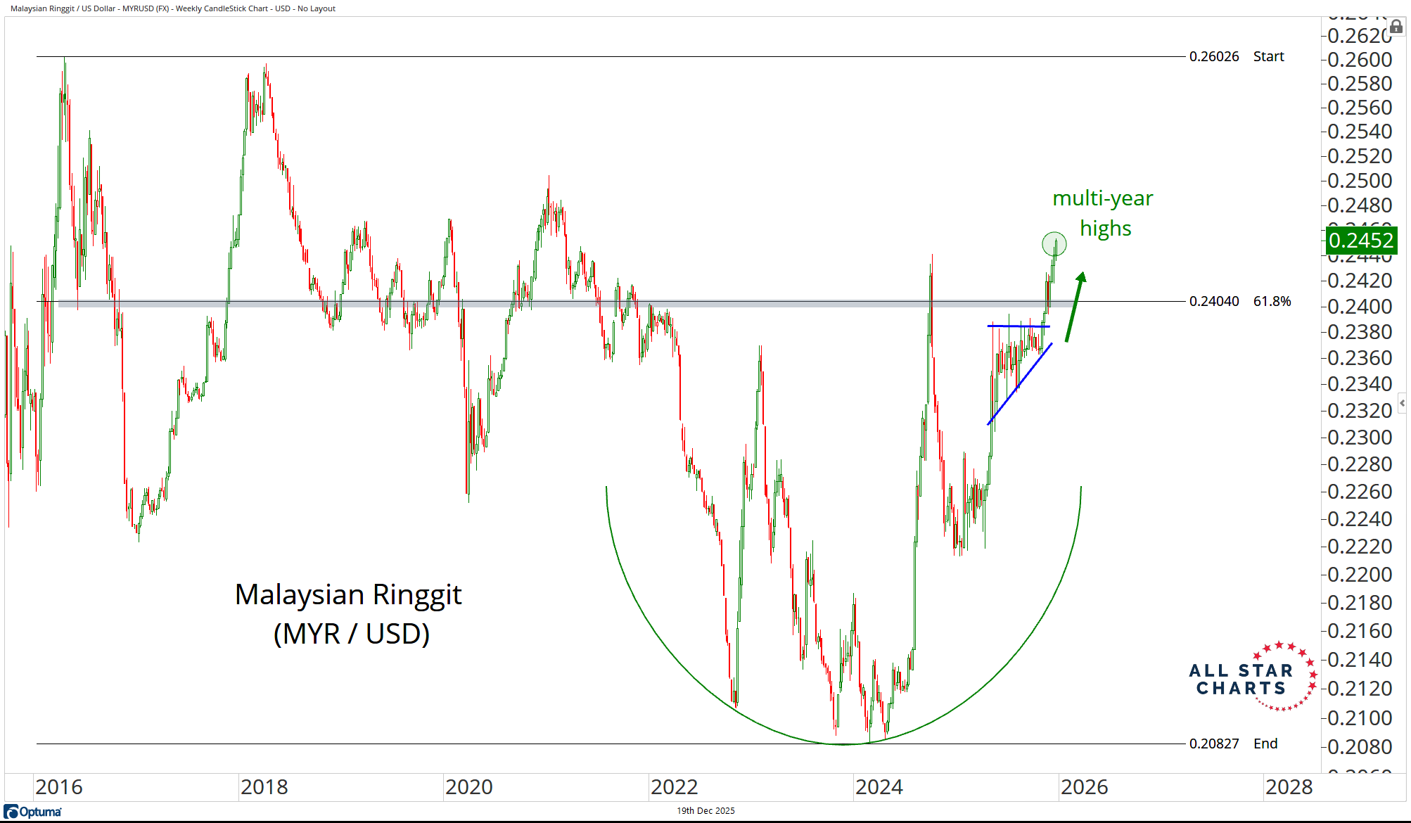 The Ringgit (MYR) has been quietly building a structural base versus the US Dollar and just resolved a textbook coil, ripping to fresh multi-year highs.