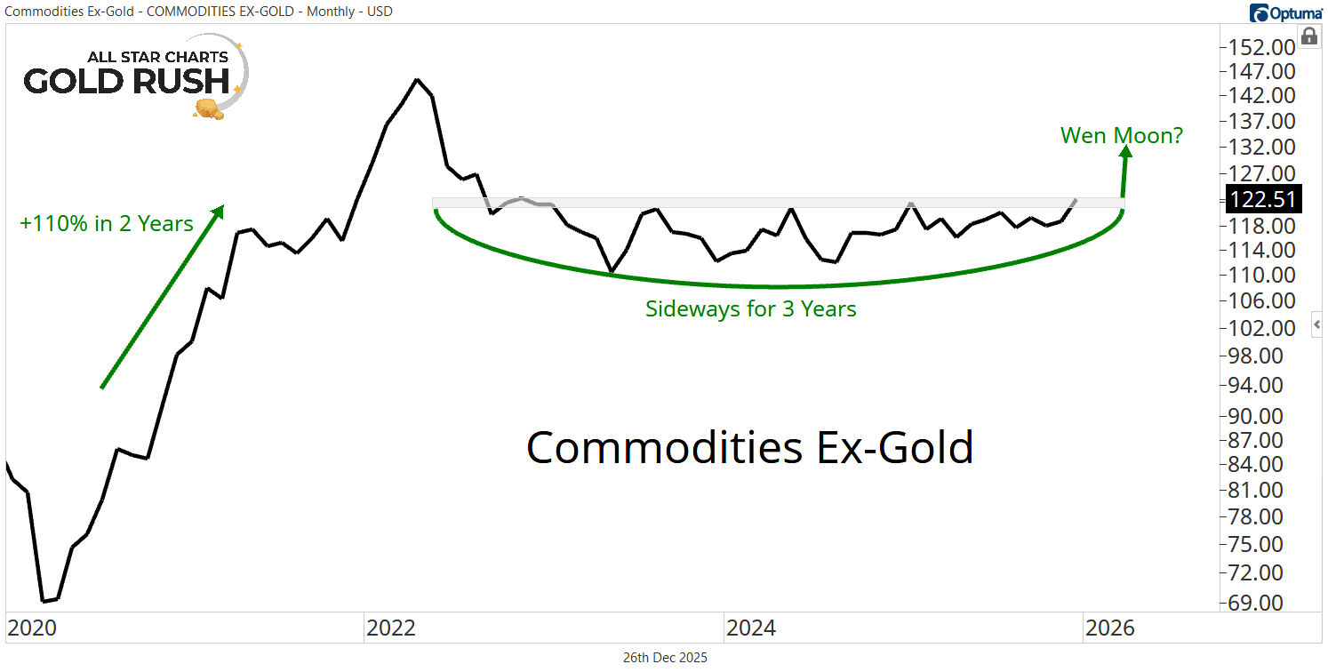 Our equal-weight basket of commodities ex-gold has spent the better part of the past three years digesting gains from the initial surge off the 2020 lows.