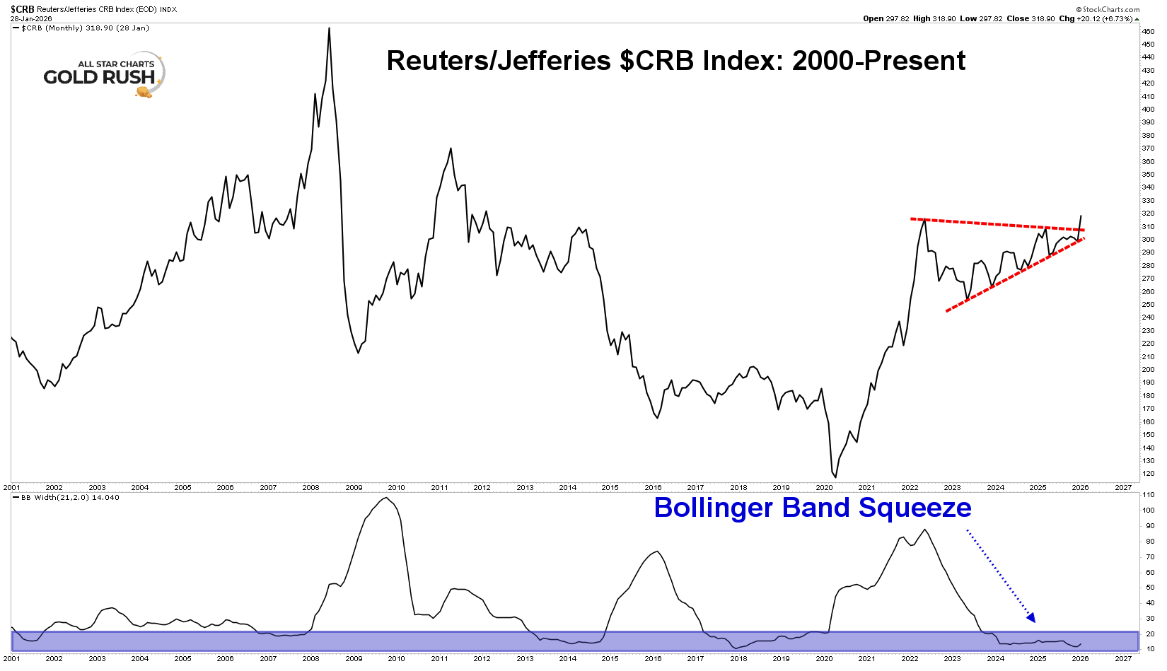 The CRB Index spent an extended period locked inside extremely tight Bollinger Bands. This is not noise. This is compression.