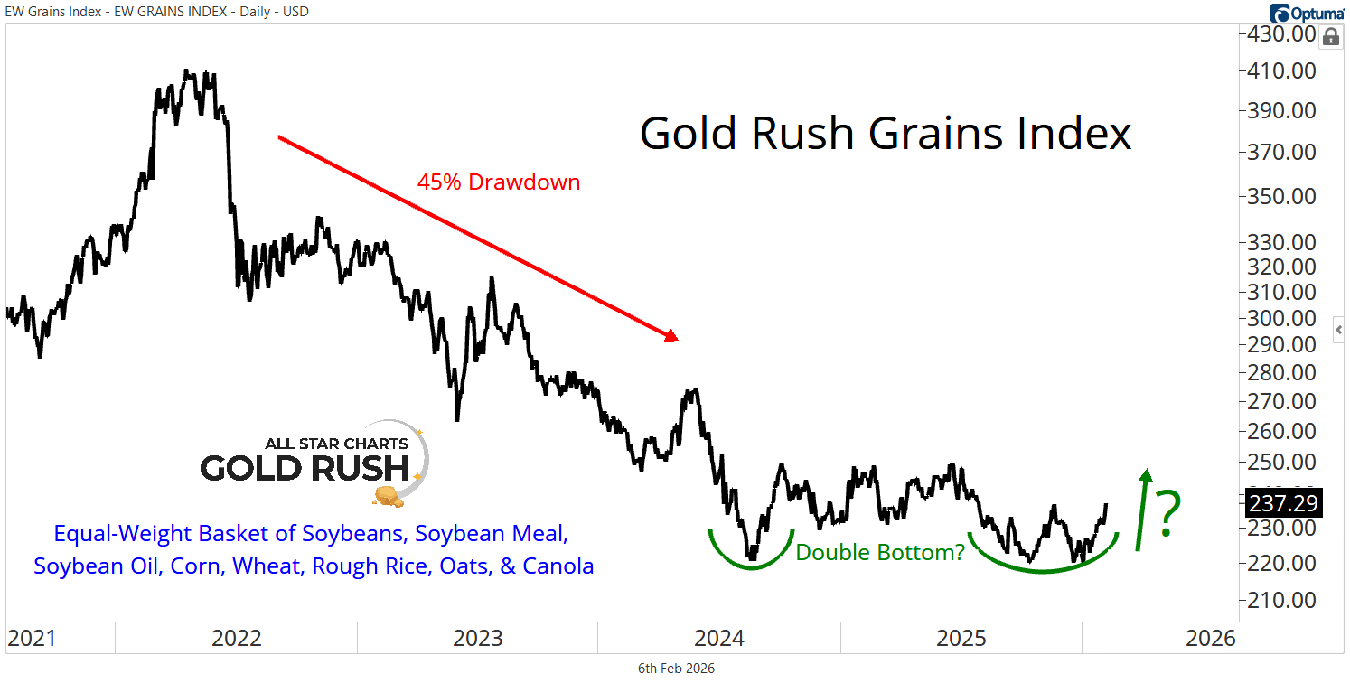 Our Gold Rush Grains Index, an equal-weight basket of Soybeans, Soybean Meal, Soybean Oil, Corn, Wheat, Rough Rice, Oats, and Canola, endured a brutal 45% drawdown over the past few years.