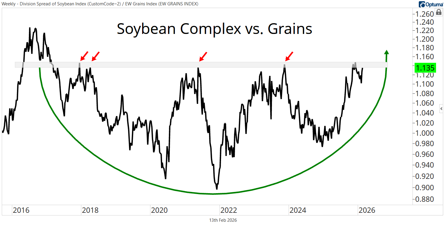When we look at the Soybean complex relative to the broader Gold Rush Grains Index, which includes Corn, Wheat, Rough Rice, Oats, Canola, and the soybean complex itself, we see an even more powerful setup.