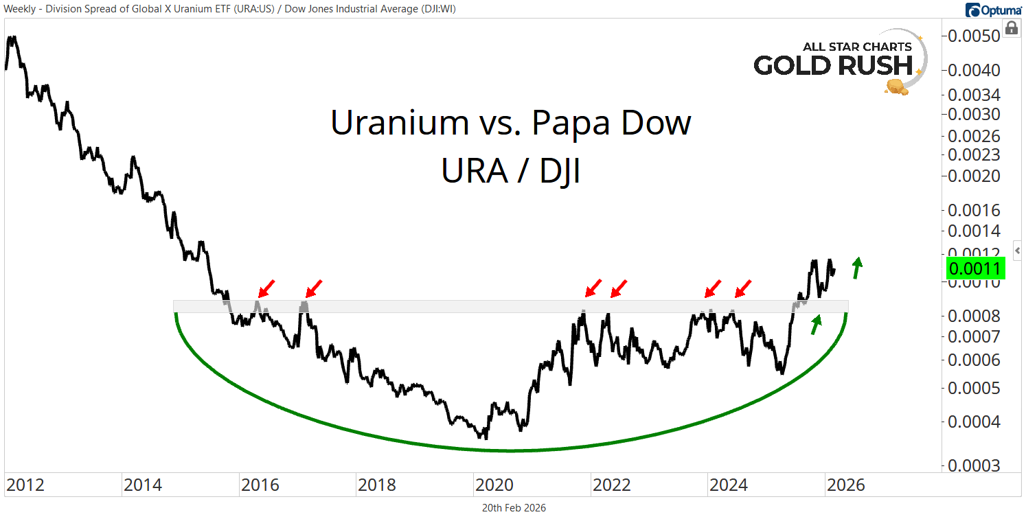Uranium stocks relative to the Dow Jones Industrial Average have spent more than a decade carving out what now appears to be a textbook multi-year bearish-to-bullish reversal pattern.