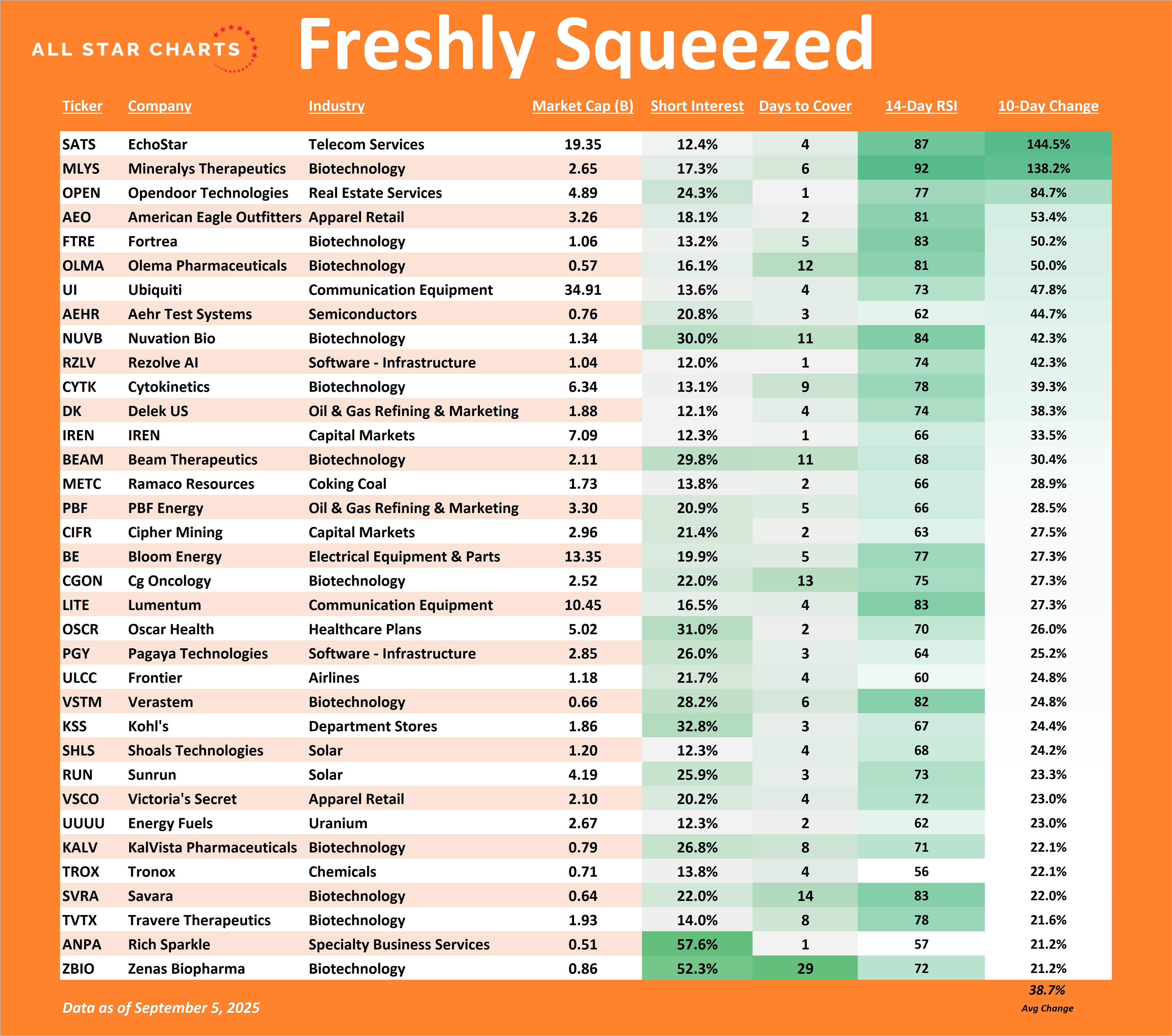 At the top of our leaderboard are names like EchoStar $SATS, Mineralys Therapeutics $MLYS, and Opendoor Technologies $OPEN. These are the kinds of stocks that are Freshly Squeezed.