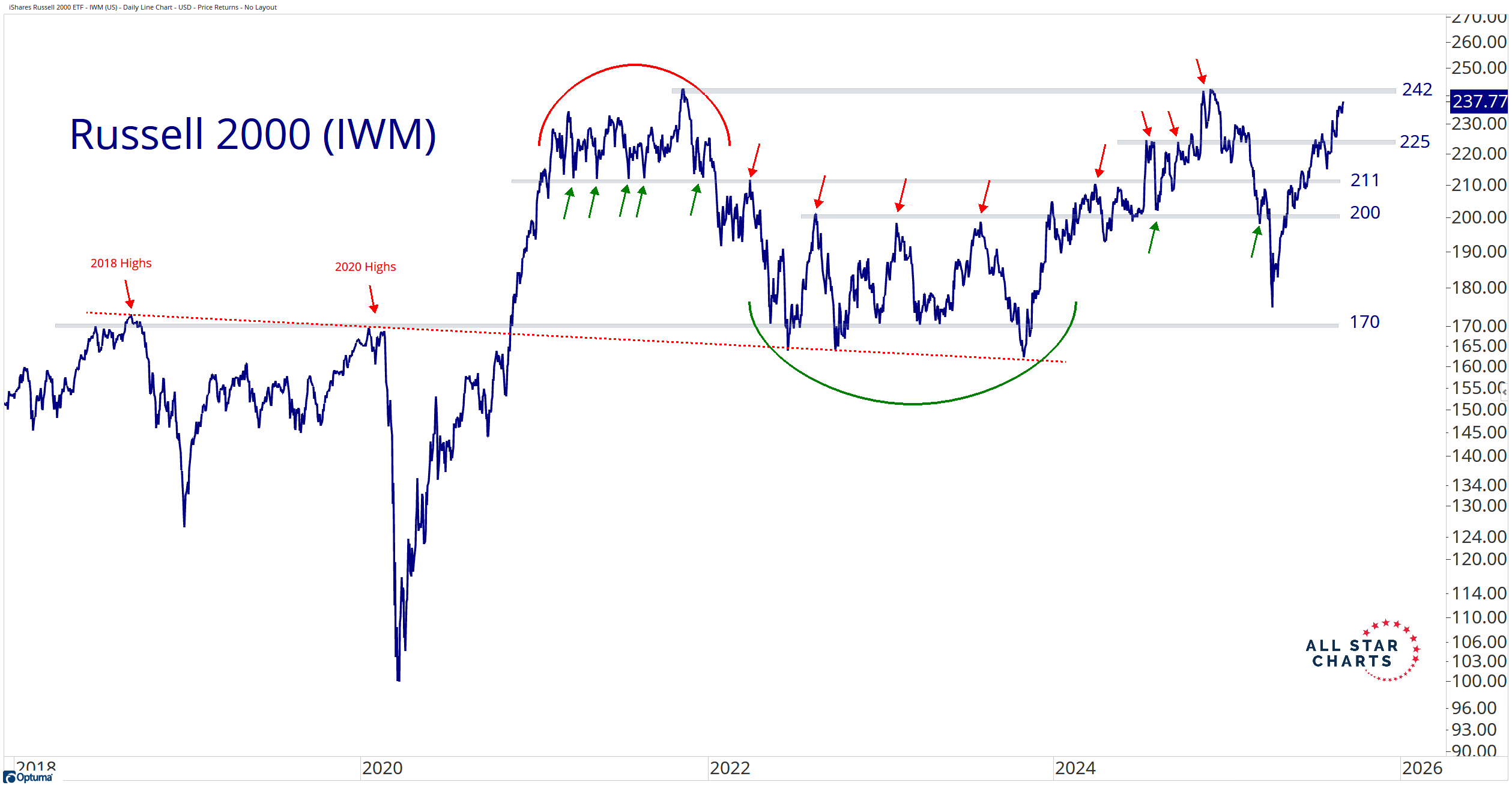 Russell 2000 is pressing against the 242 highs, the same level that capped every rally for nearly three years. If IWM can clear 242 with conviction, it wouldn’t just be a breakout. It would be a regime shift, turning one of the most important risk barometers in the market from dead weight into leadership.