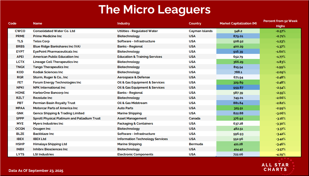 The Micro Leaguers focuses on companies with a market cap between $100M and $1B — the real micro-caps — sorting names by proximity to new 52-week highs.